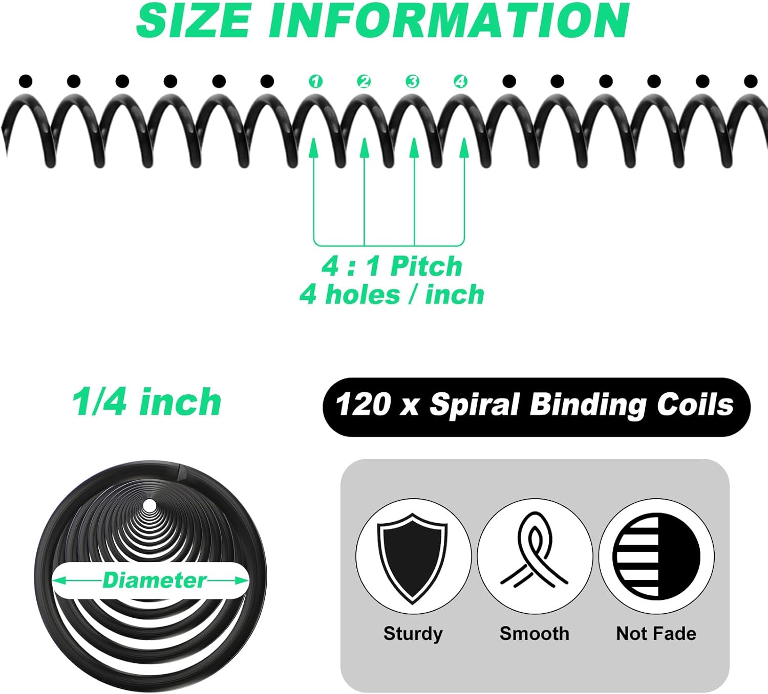 Leinuosen 120 Pack Plastic Spiral Binding Coils Kit Spirals Multi Size Coils for Binding Binder Combs Spines(1/4 Inch,Black)