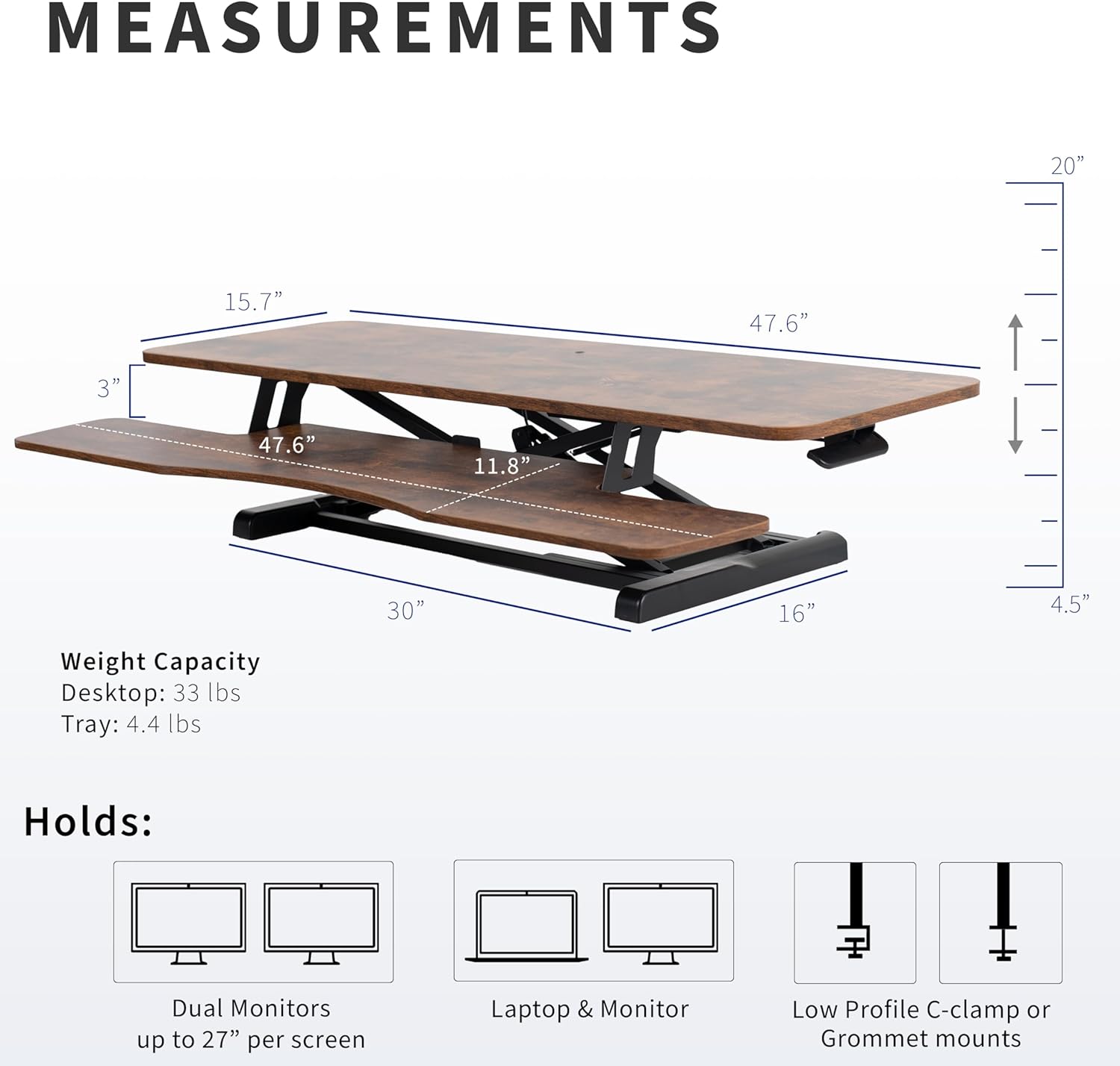 - Spacious 48” Surface: The large top surface measures 47.6” x 15.7”, providing plenty of room for dual monitor and laptop setups. The 47.6” x 11.8” (10.2” in center) keyboard tray raises in sync with the top surface to create a comfortable workstation