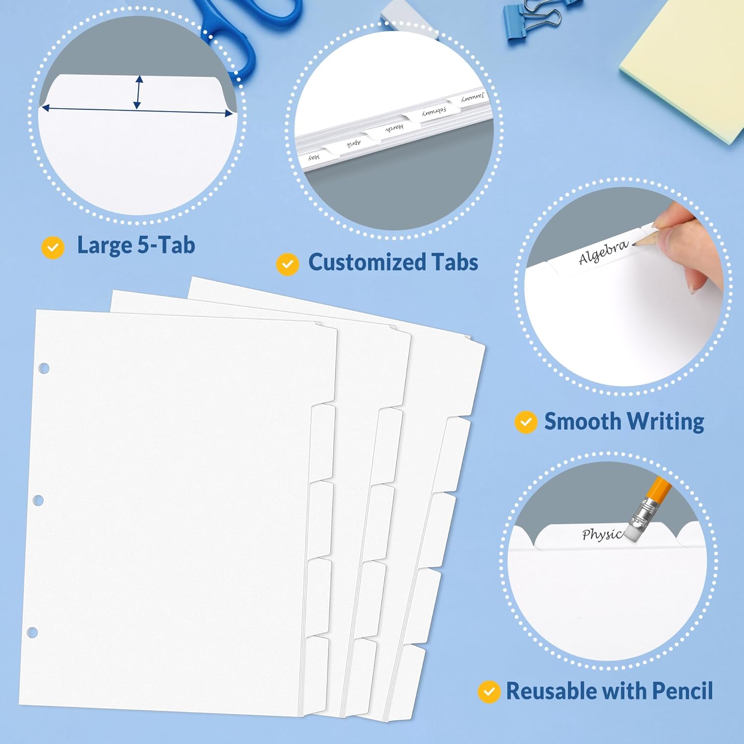 - Letter Size Dividers: Each 5 tab dividers for 3 ring binder is 8.5x11 inches - letter size. Each of our tab divider for 3 ring binder comes with relatively large tabs, making it easy to customize and categorize.