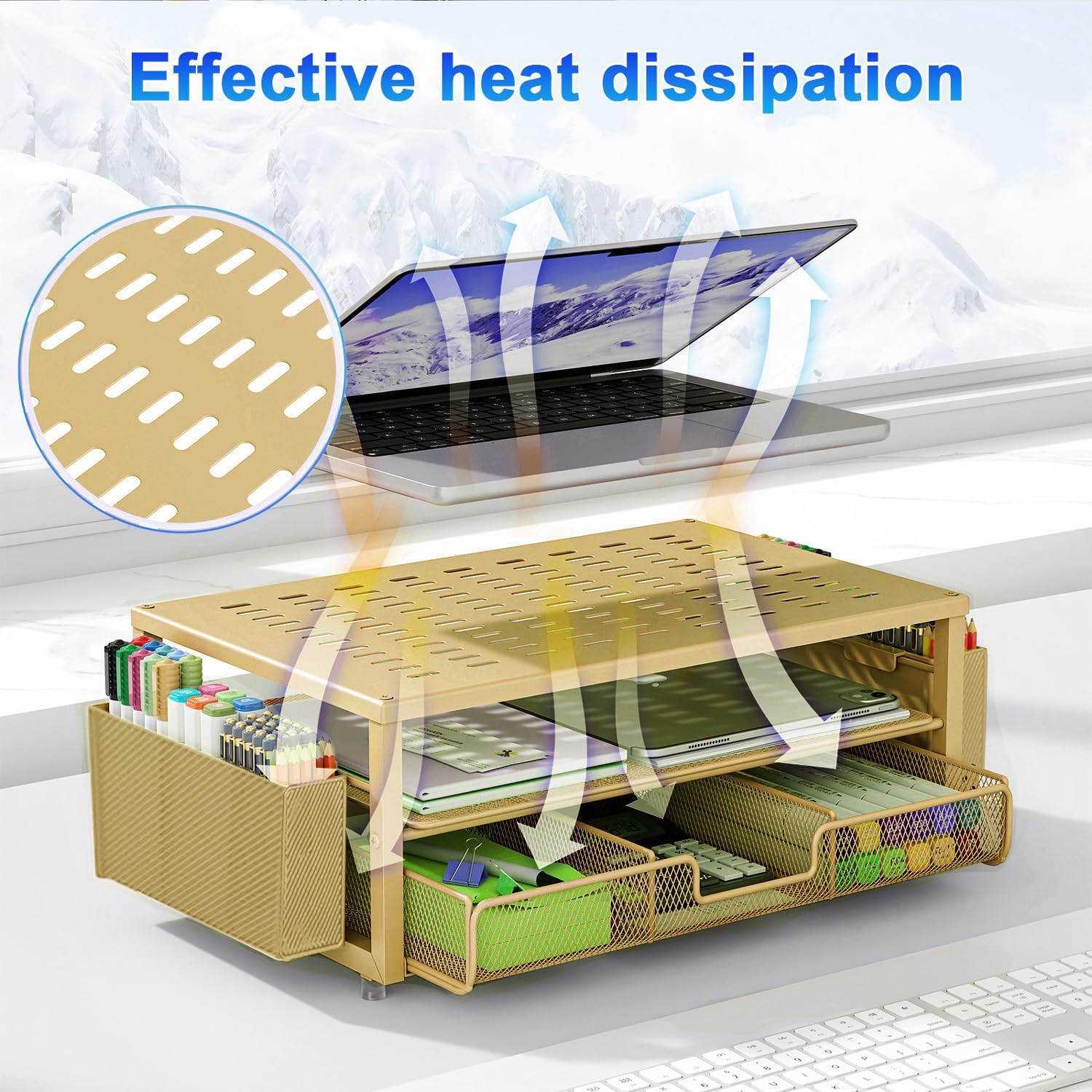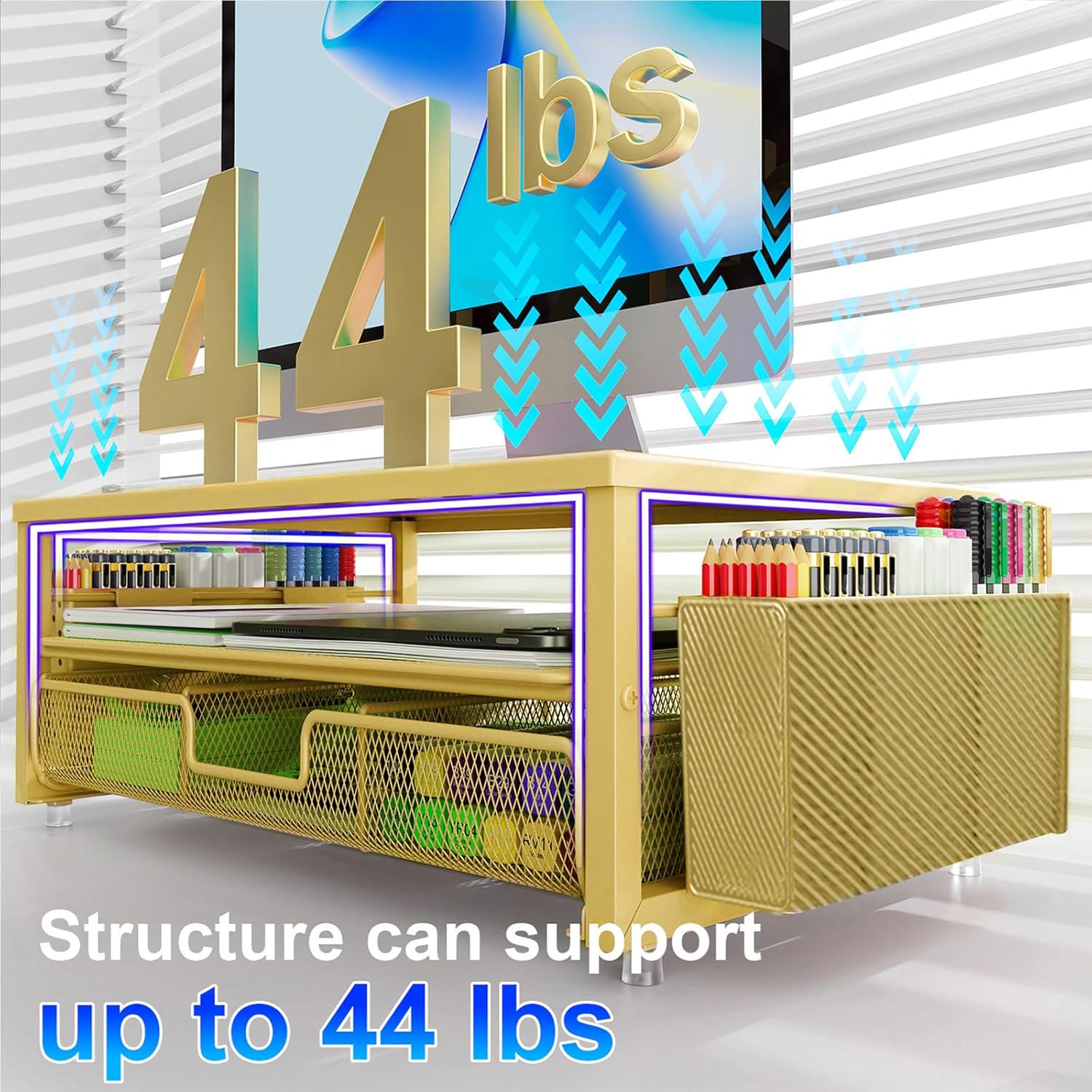 gianotter Desk Organizers and Accessories, Monitor Stand with Drawer and 2 Pen Holder, Desktop Organizer Suitable for Offices and Dormitories (Gold)