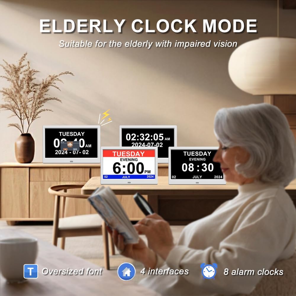 - 【Elderly Clock】: It features an extra-large high-definition screen . The time, date, and day of the week are shown in large, non-abbreviated, and【 easy-to-read font, making it ideal for seniors】. Additionally, it includes 8 icon-based alarm groups for activities such as taking medication, exercising, and waking up. When an alarm goes on, the corresponding icon is displayed to remind you of the current activity. it has a voice time announcement feature that announces the time every hour