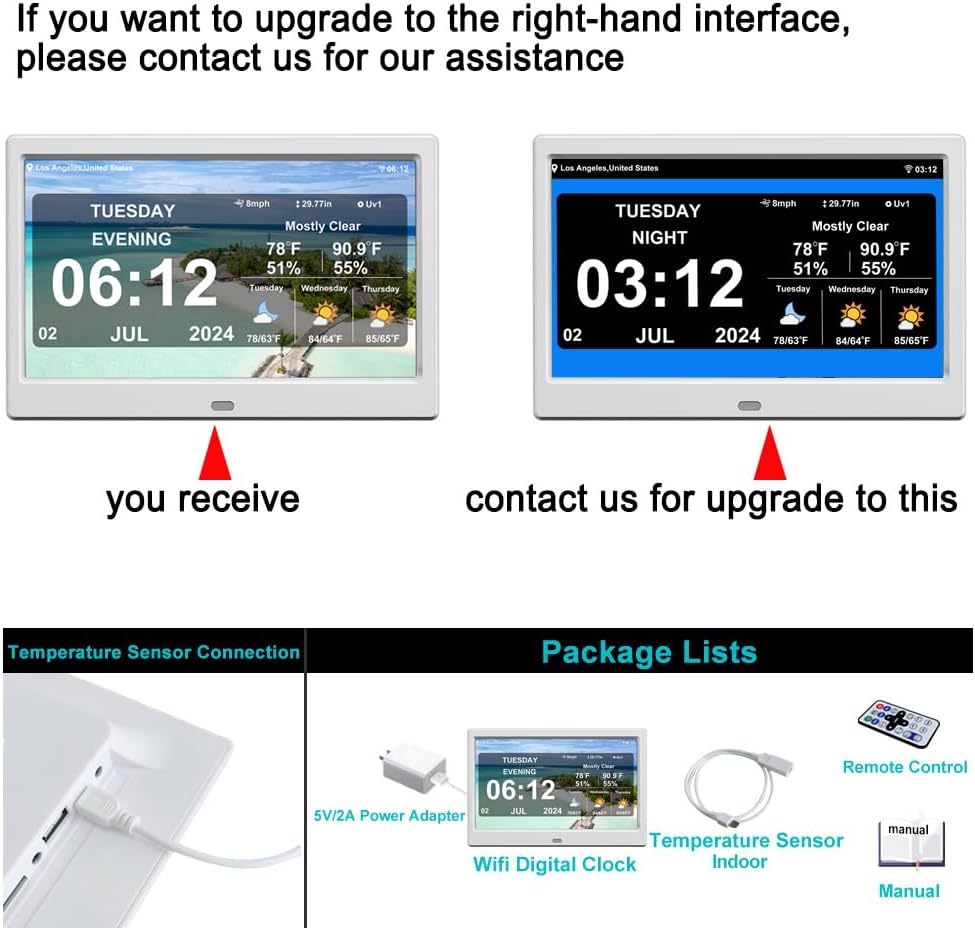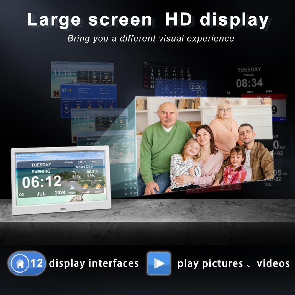 - 【12 Display Interfaces】: offers 12 different display interfaces, each highlighting different information to meet the needs of various users and scenarios. For example, weather clock interface mainly provides weather forecasts, temperature, humidity, and the time and date. The perpetual calendar interface displays the calendar and date in full screen. The elderly clock interface features extra-large fonts, with font colors adjustable to white, green, blue, or red to suit individual preferences