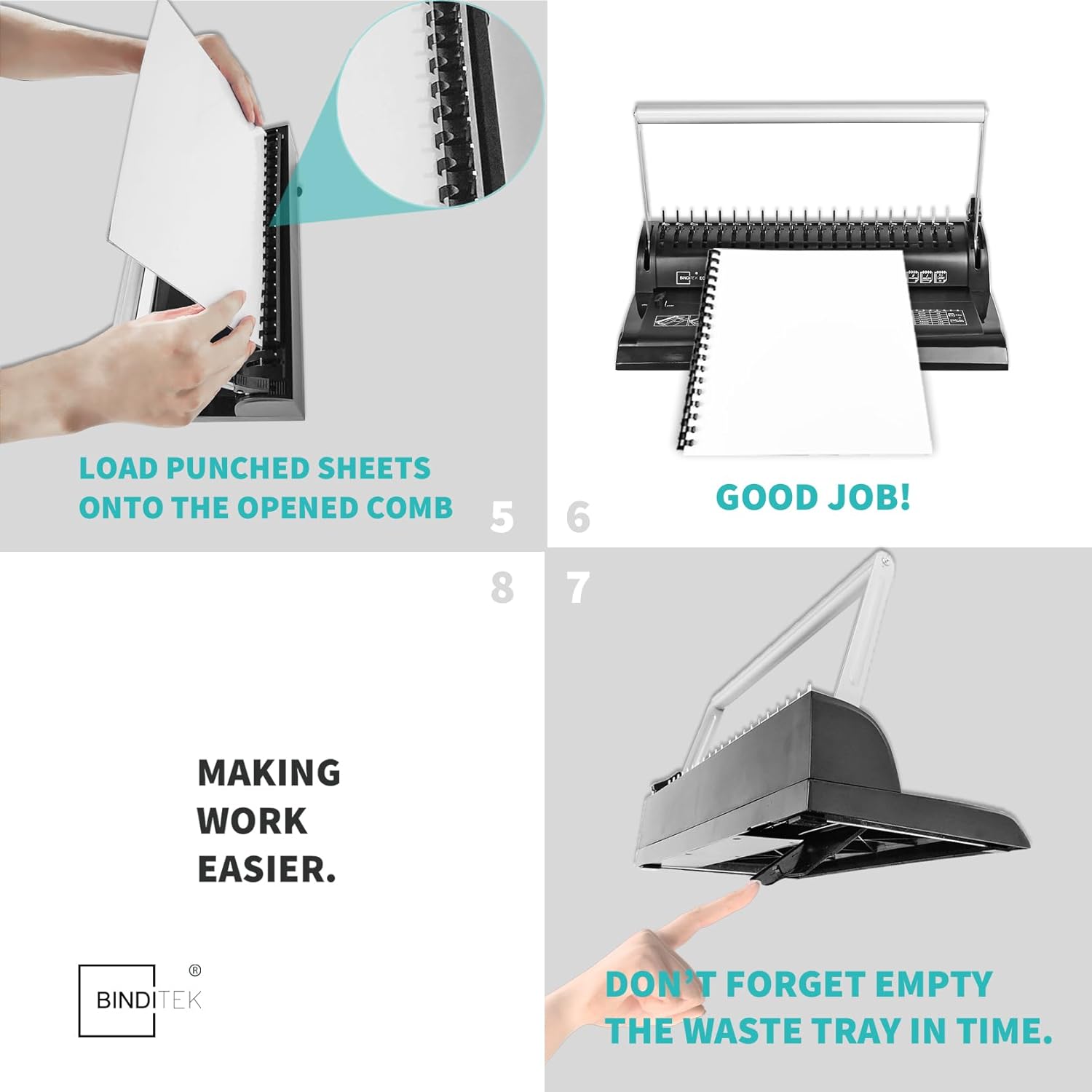 - ➤Tips: ①Make sure to press the punching handle all the way down in one continuous motion. Avoid stopping halfway, as this may cause the papers to get stuck. ② If you're punching 8 sheets of paper at once, you might need to use a bit more force. For a more effortless experience, try punching fewer sheets at a time and repeat as needed. ③ When binding, position the binding comb with its open side facing upward to ensure everything aligns perfectly.