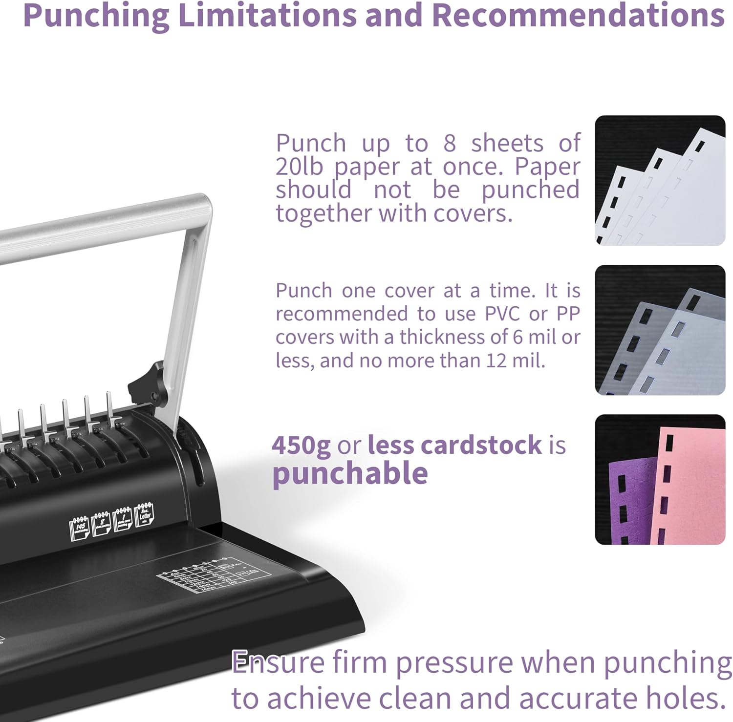 - 【Punching Capacity of 8 Sheets】The comb binding machine can manually punch up to 8 sheets of #20 paper at once without any misaligned holes or burrs. Note: Only 8 sheets of 20lb paper can be punched at a time, and covers should not be punched together with paper. Only one cover should be punched at a time, and it is recommended to use PVC or PP covers with a thickness of 6 mil or less, and no more than 12 mil. Cardstock up to 450g can also be punched.