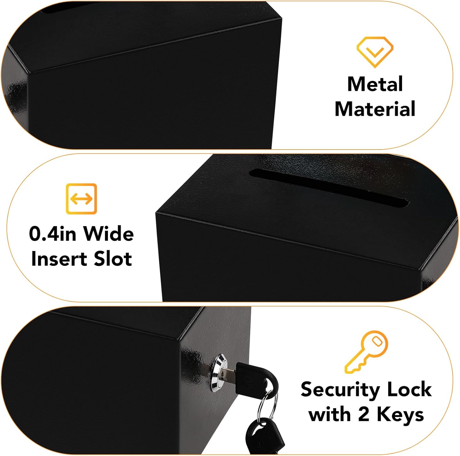 - Package Includes: This black metal box with a waterproof sleeve,two keys, a support plate that can be inserted into the sleeve, You can use it very easily.Security locking mechanism: The donation box is equipped with a security locking mechanism, two keys, and a sturdy structure to ensure your safety