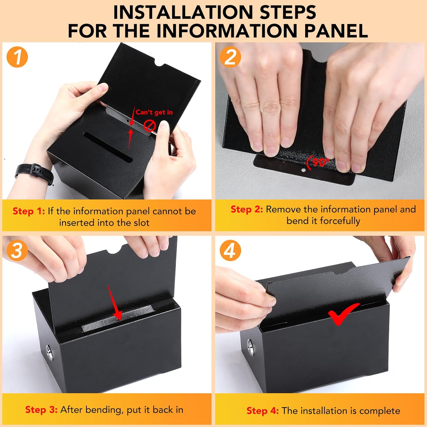 - Metal Suggestion Box User Guide:1. To prevent loss during shipping, the keys are pre-placed inside the locked suggestion box.Retrieval Steps:① Tilt the box towards the letter slot.② Gently shake the box to work the keys out through the letter slot.(Key size is designed specifically for the slot—easy retrieval guaranteed.)2. Information Panel Installation Guide Initial Setup:Locate the insert tab on the metal information panel .Bend the tab along the fold line to 90–120 degrees