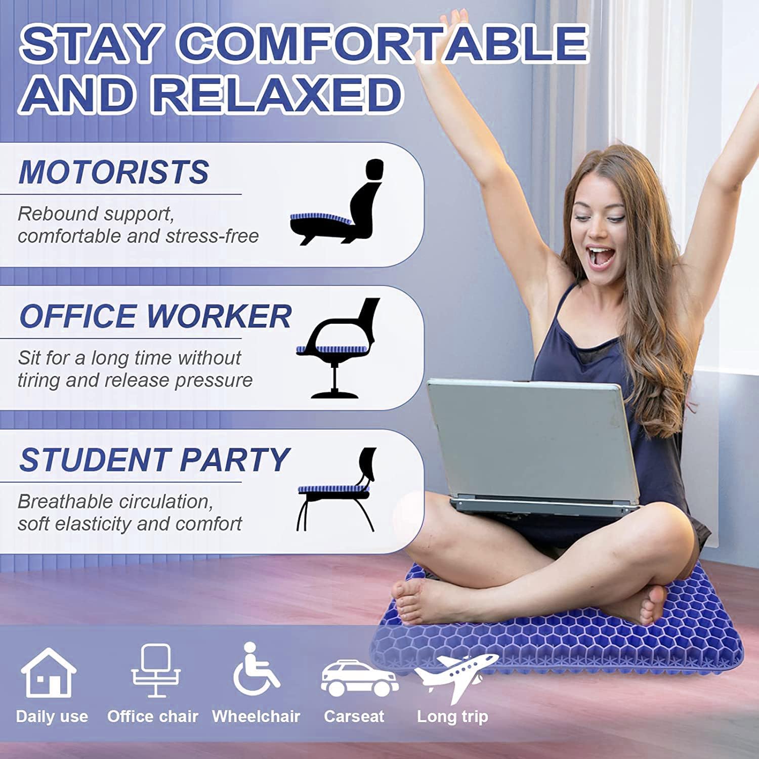 - 【Upgraded Double Thick Gel Seat Cushion】The latest gel seat cushion design with double thick honeycomb grids, that can provide maximum support and comfort while reducing stress, you can sitting for a long time without feeling tired.