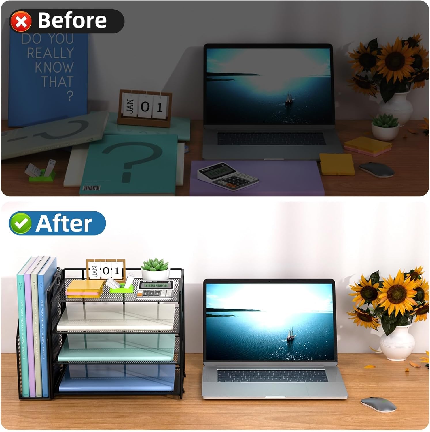 Marbrasse Desk Organizer and Accessories,4-Tier Paper Letter Tray Organizer with File Holder,Desk Accessories & Workspace Desktop Organizers for School Home Office Supplies (Black)