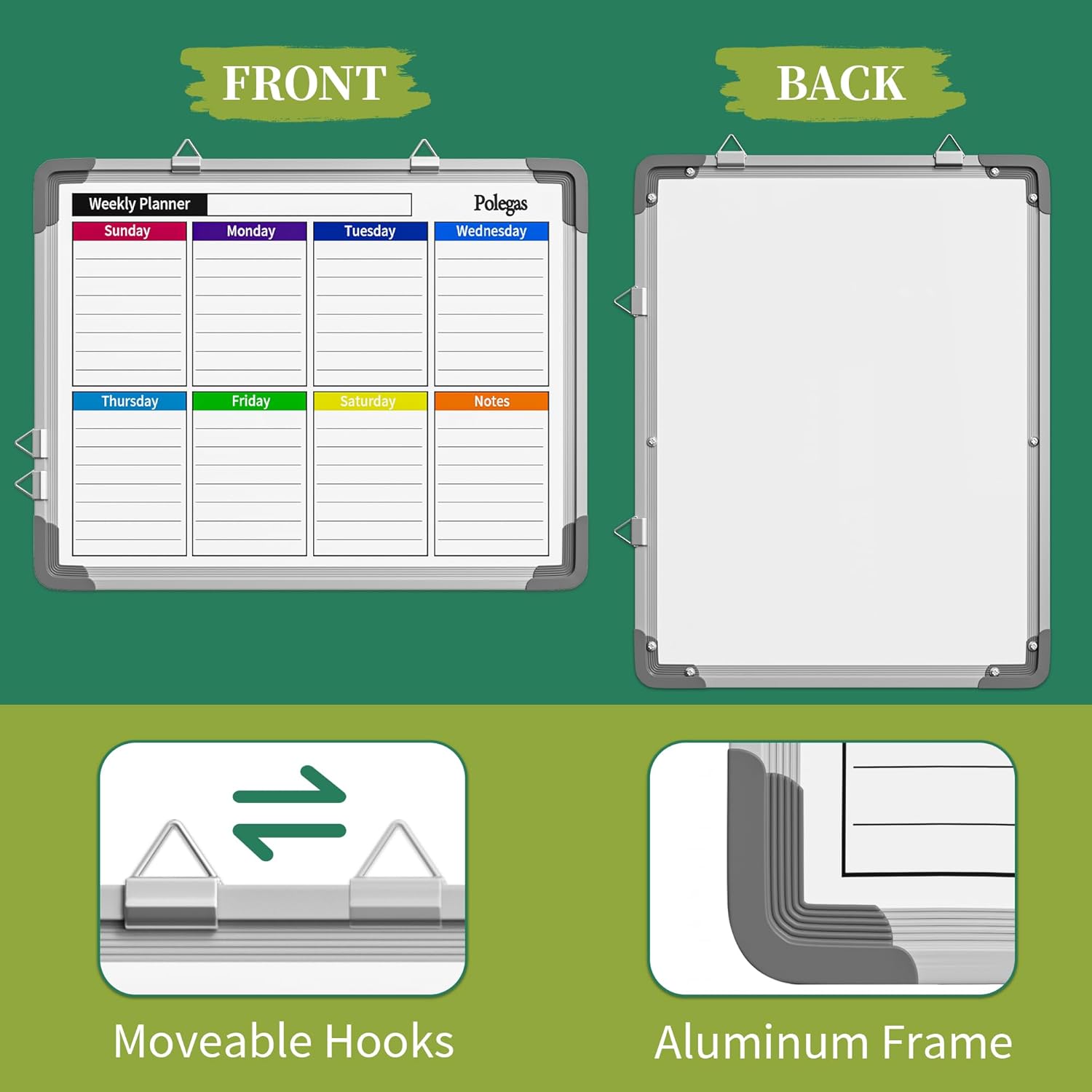 - Durable & Portable Calendar Whiteboard: Dry erase calendar for wall with aluminum frame is solidly built, not easy to scratch or break. Featured with stain resistant surface, you can erase for countless times without any smudgy ghosting or staining. The movable hanging hooks can be adjust the hanging distance, allows you to set up your dry erase board calendar either horizontally or vertically. Small portable white board is lightweight, it is suitable for handheld as well.