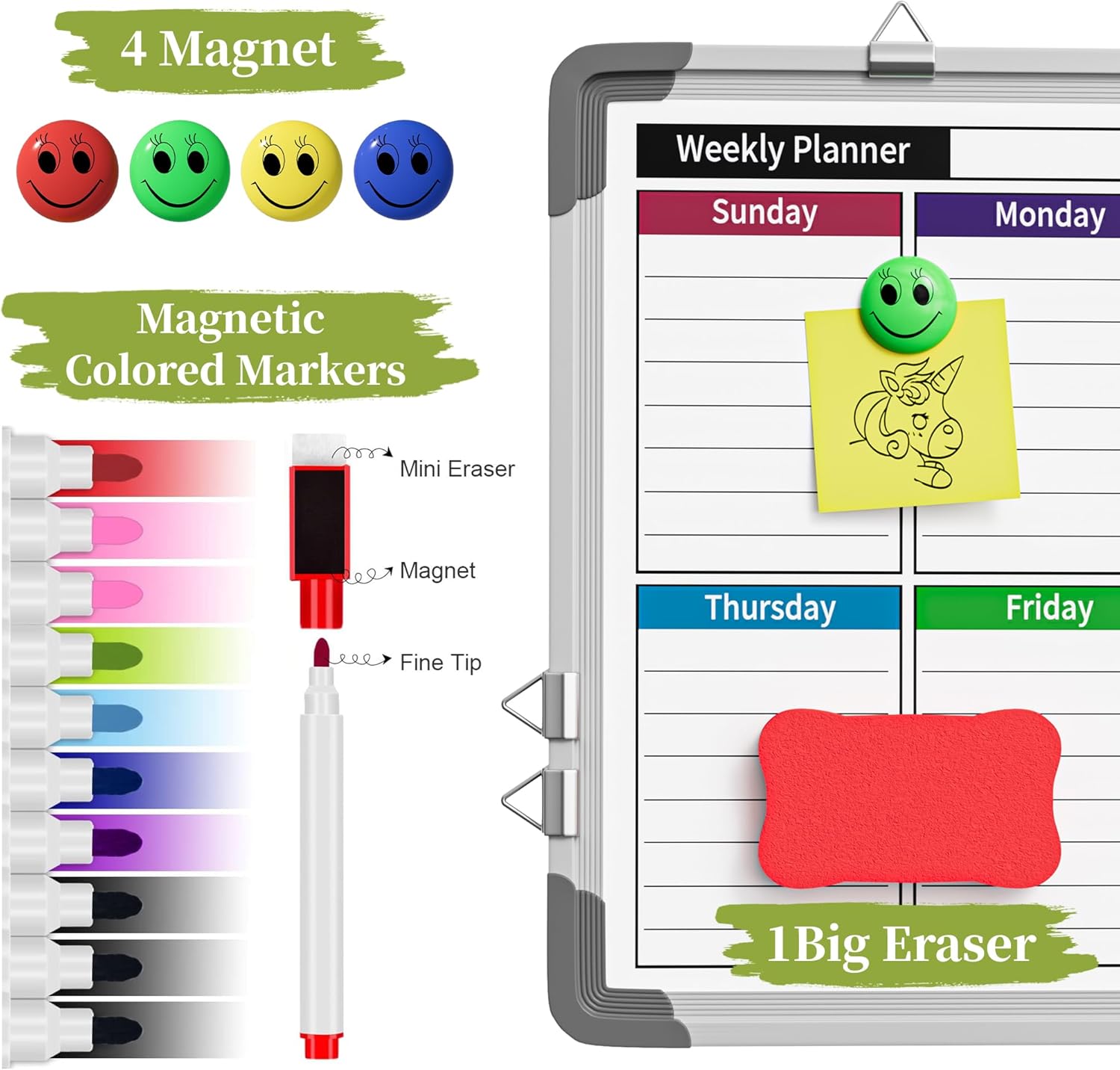 - Smooth Writing & Easy To Clean: Magnetic monthly white board for wall has a smooth and durable writing surface. It's easy to write on and easy to wipe clean without stain. The markers are 100% safe for kids, odor free. Vibrant intense color can last long time for use. Included dry eraser and mark cap in the accessories can clean the content on the calendar white board. Great to teach your kids the value of getting organized and always be on time.