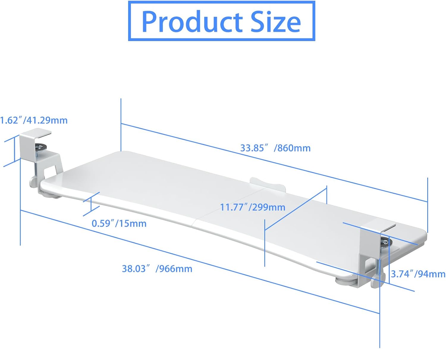 - Universal - This 34" (38" including clamps) x 11.8" under-desk keyboard tray holds your keyboard, mouse, and other small accessories below the desktop to add work space. Please not it does NOT fit if your desk thickness is over 1.57”.
