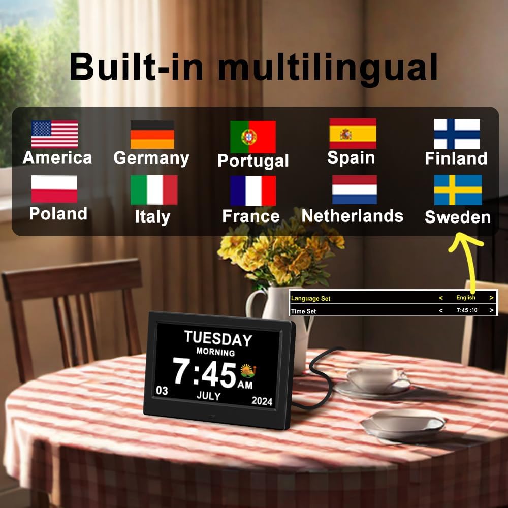 - 🕔Auto Diming, 10 national system languages🕔 Screen brightness can be set to automatic diming mode, so brightness can be automatically adjusted during the day and night. You can also set a fixed brightness to meet your needs in different occasions; The clock is equipped with 10 national system languages: English, German, Spanish, Portuguese, French, Italian, Dutch, Czech, Polish, Swedish