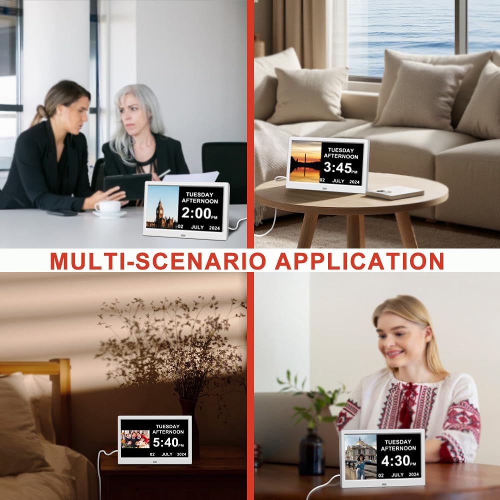 Alarm Clock with Day and Date for Elderly Digital Calendar Clock Photo Frame- Auto Dimmable Display 15 Alarm Options (10inch White)
