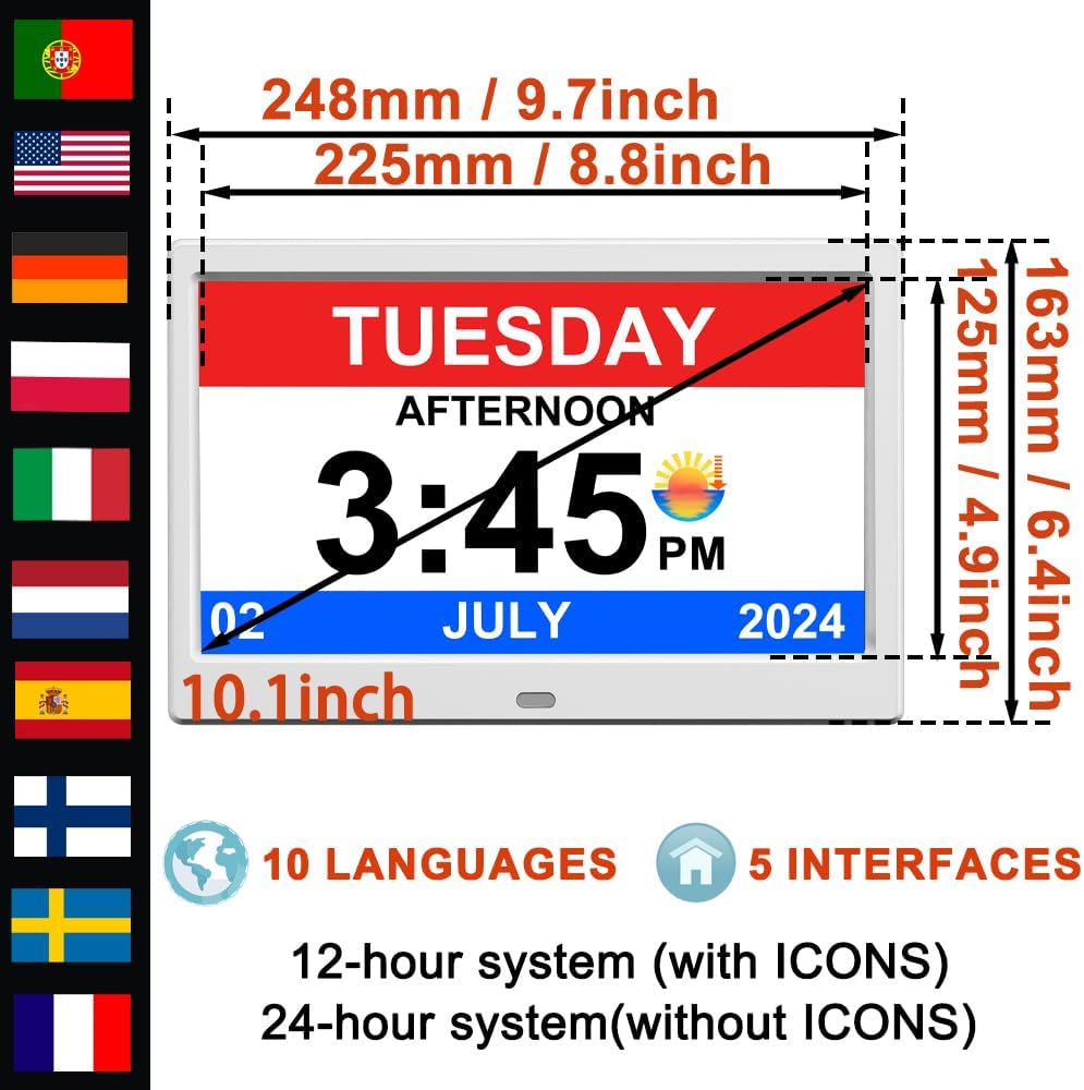 - 🕔Auto Diming, 10 national system languages🕔 Screen brightness can be set to automatic diming mode, so brightness can be automatically adjusted during the day and night. You can also set a fixed brightness to meet your needs in different occasions; The clock is equipped with 10 national system languages: English, German, Spanish, Portuguese, French, Italian, Dutch, Czech, Polish, Swedish