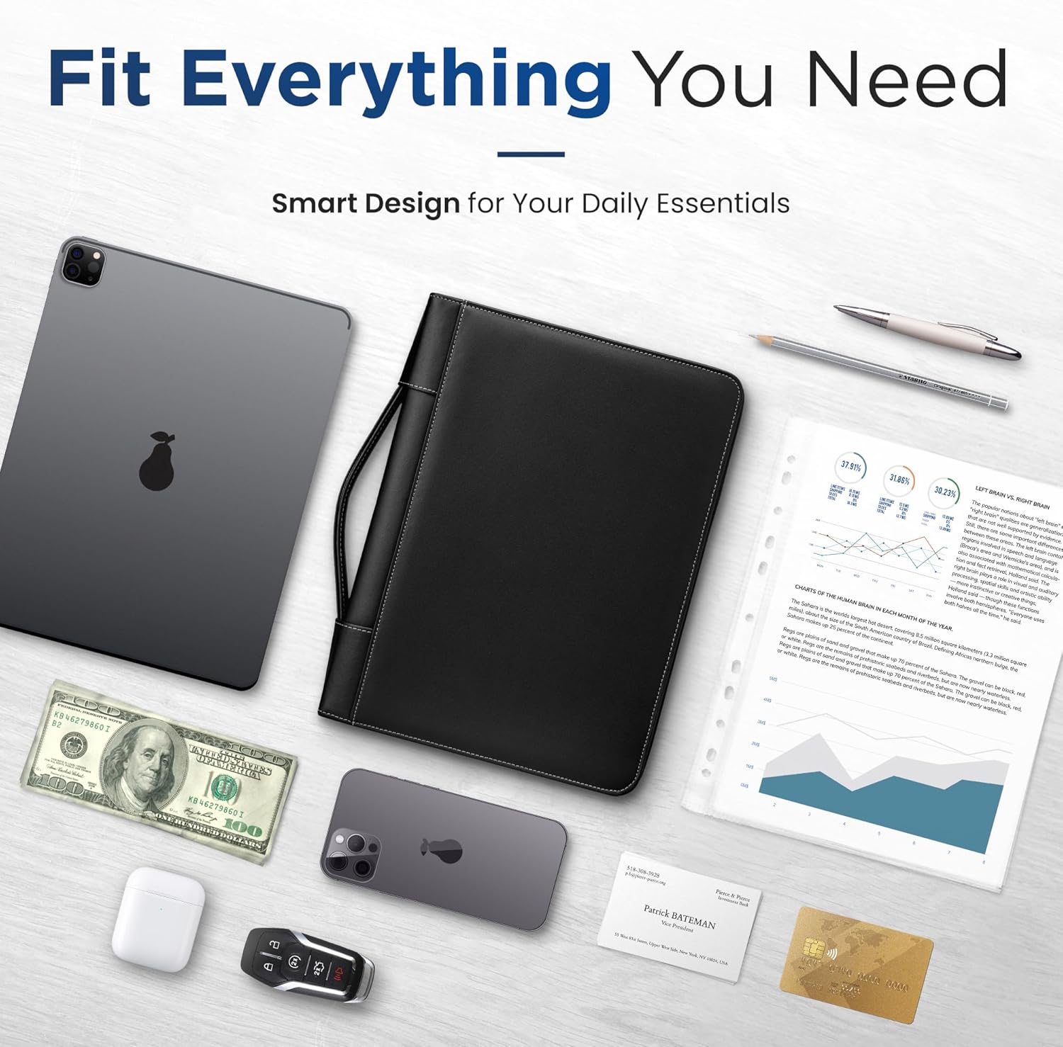 - ✅ SLEEK & PROFESSIONAL: Comes with a retractable carrying handle for convenient carry. The convenient dual zip design makes opening and closing the zipper binder 3 ring a real breeze. Includes business cards slots, a pen holder & a refillable writing pad. Fits most briefcases & bags.