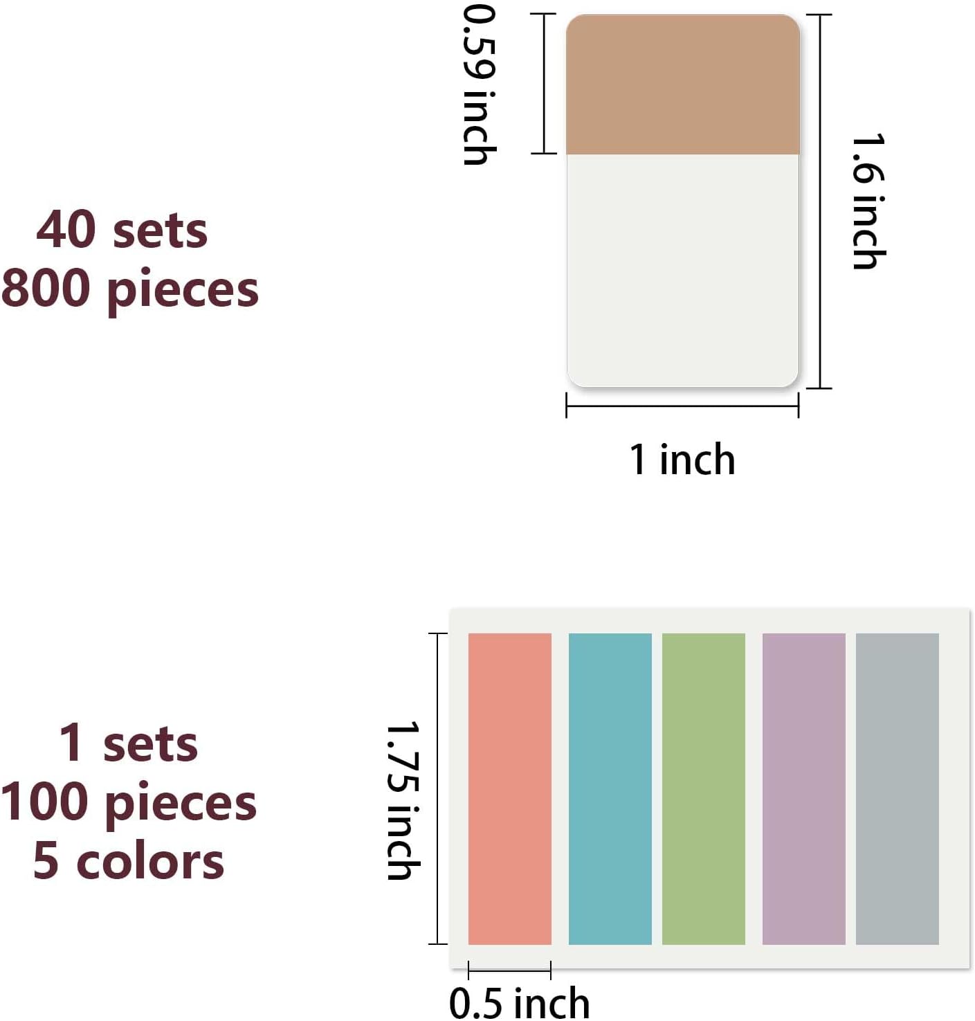 - 900 Pieces Tabs: totally 900 pieces 41 sets in total,800 pieces 1 inch adhesive index tabs in 40 sets with 10 different pastle colors,100 pieces 0.5 inch tabs in 1 sets, 20 pieces each color and color as picture displayed