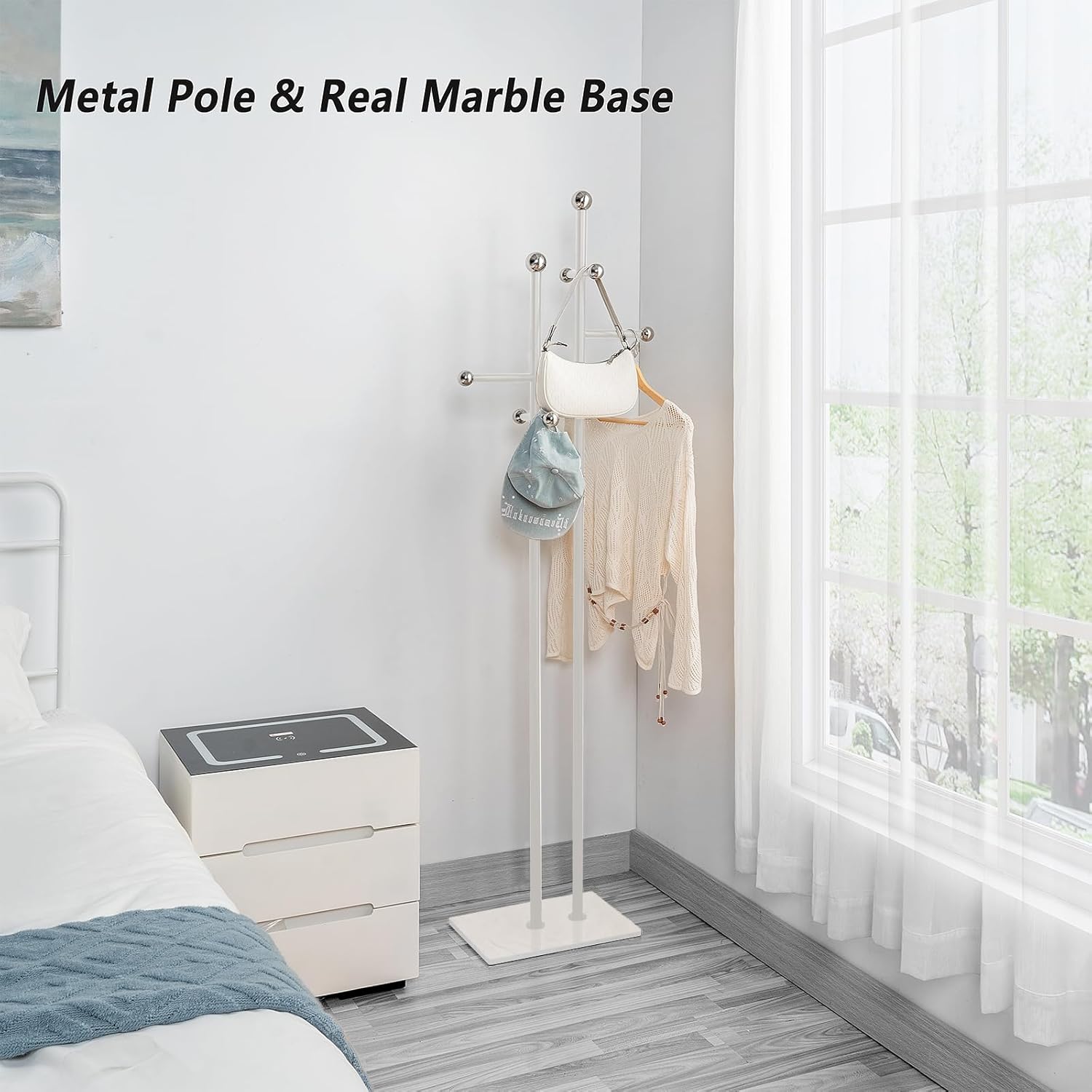 Free Standing Coat Rack with Marble Base & 8 Steel Hooks Clothes Rack for Entryway Bedroom Living Room Hotel 14.96 x 10.24 x 68.9 Inches (White)
