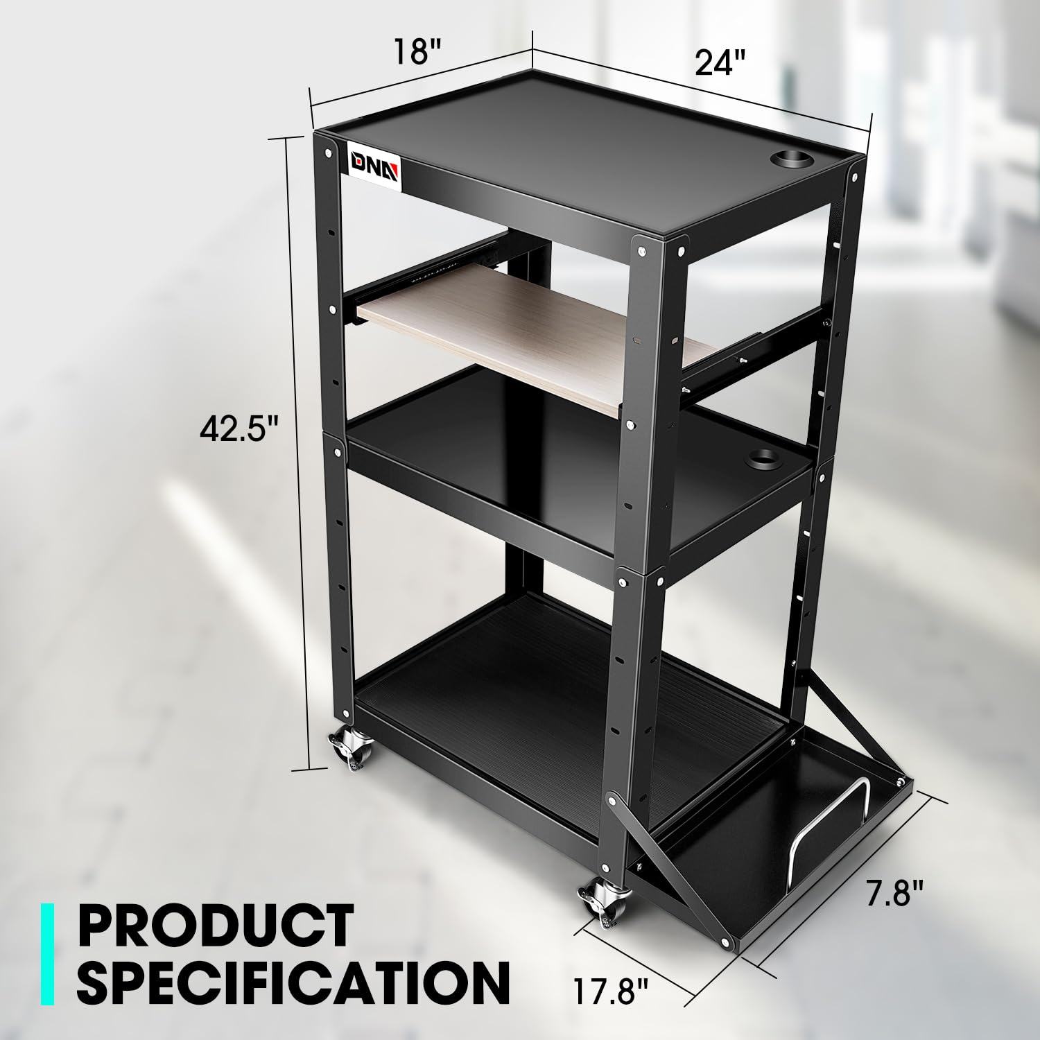 DNA MOTORING Steel AV Cart 3-Layer Rolling Projector Utility Cart, 24" X 18" X 24.6"- 42.5" Height Adjustable, with Wheels, Pullout Keyboard Tray, Power Strip, Cord Management, TOOLS-00497