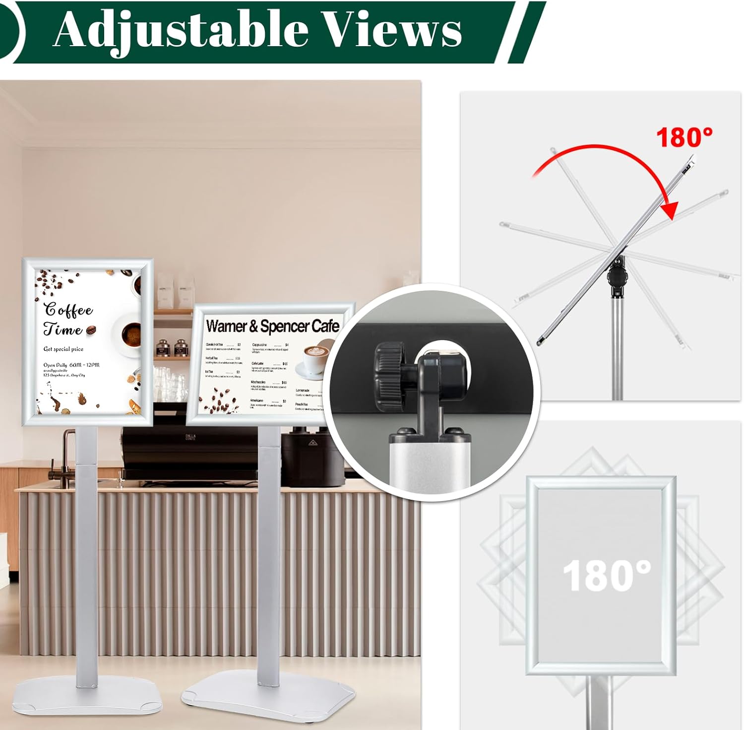 - ✅【180° & 360° Adjustable Views】Our sign stand offers complete flexibility with 180° and 360° adjustable views, allowing you to showcase your posters from any angle.