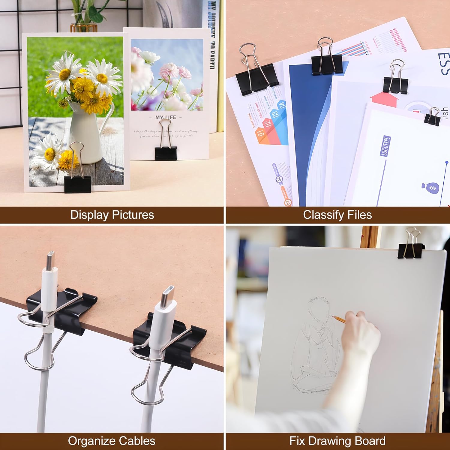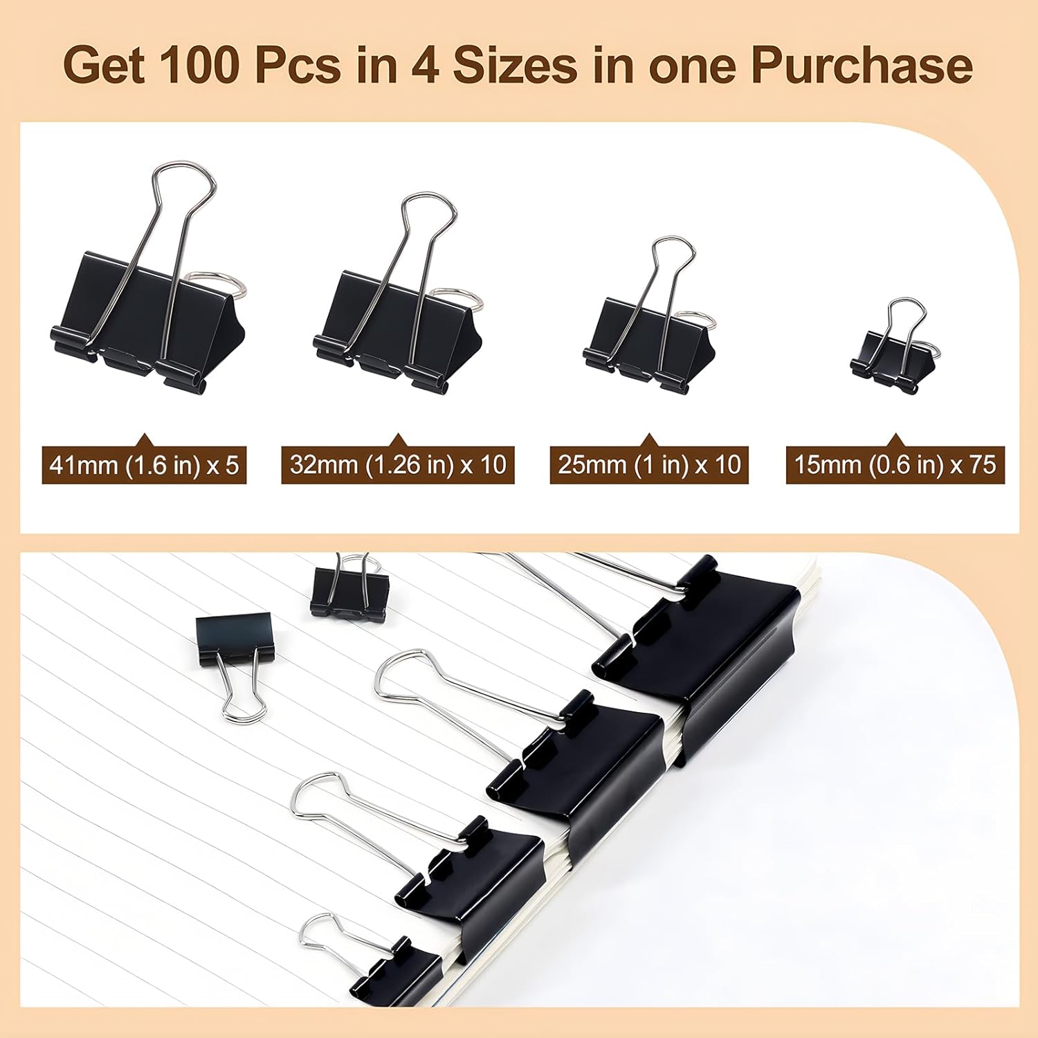 - Assorted Sizes: Includes 100 black metal binder clips in 4 sizes - 15mm (mini) x 75 pcs, 25mm (small) x , 32mm (medium), and 41mm (large) - for various paper clipping needs.