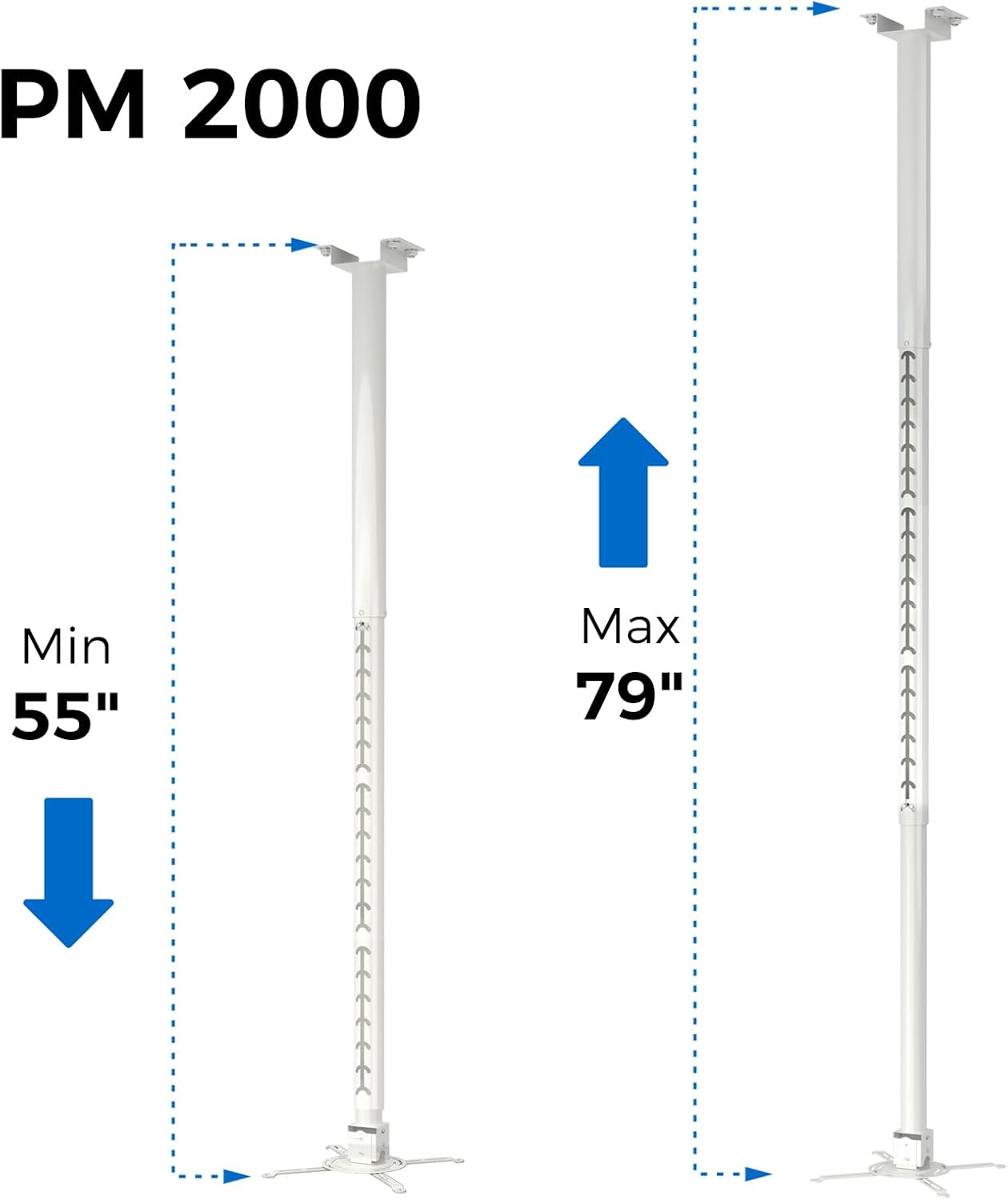 - Full Motion Adjustability: Equipped with a retractable aluminum column, the SCREENPRO ceiling projector mount allows for easy height adjustment to meet different installation requirements. It supports a 30° tilt, 10° swivel, and 360° rotation, ensuring the perfect viewing angle for any setup. The extendable arms adjust from 55 inches to 79 inches, offering flexibility in placement.