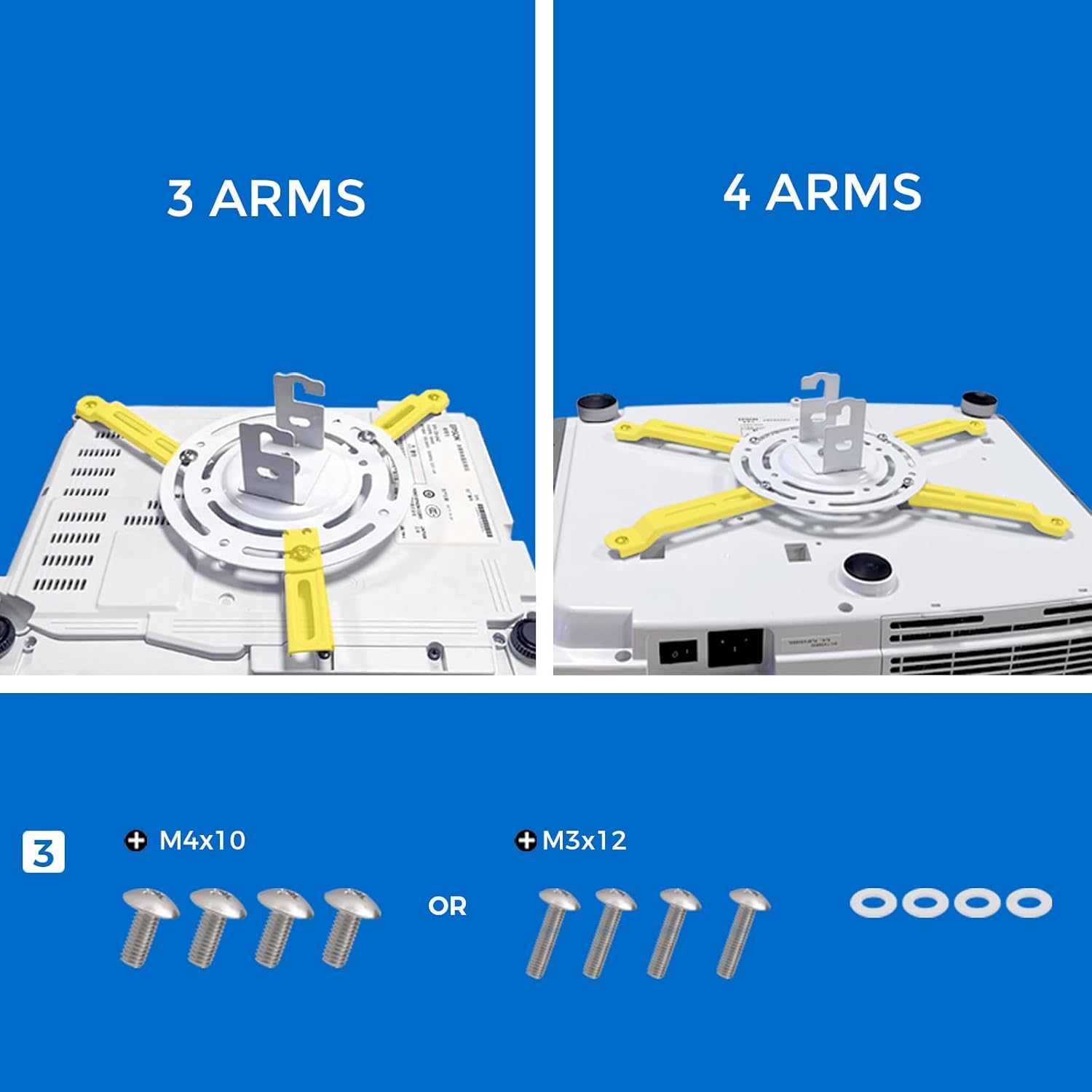 - Universal Compatibility: The SCREENPRO ceiling projector mount is designed to fit most mainstream home projectors on the market. Its white powder-coated finish blends seamlessly into the decor of most homes and offices. The adjustable base arms extend from 3.7 inches to 13.4 inches, accommodating various projector mounting patterns.