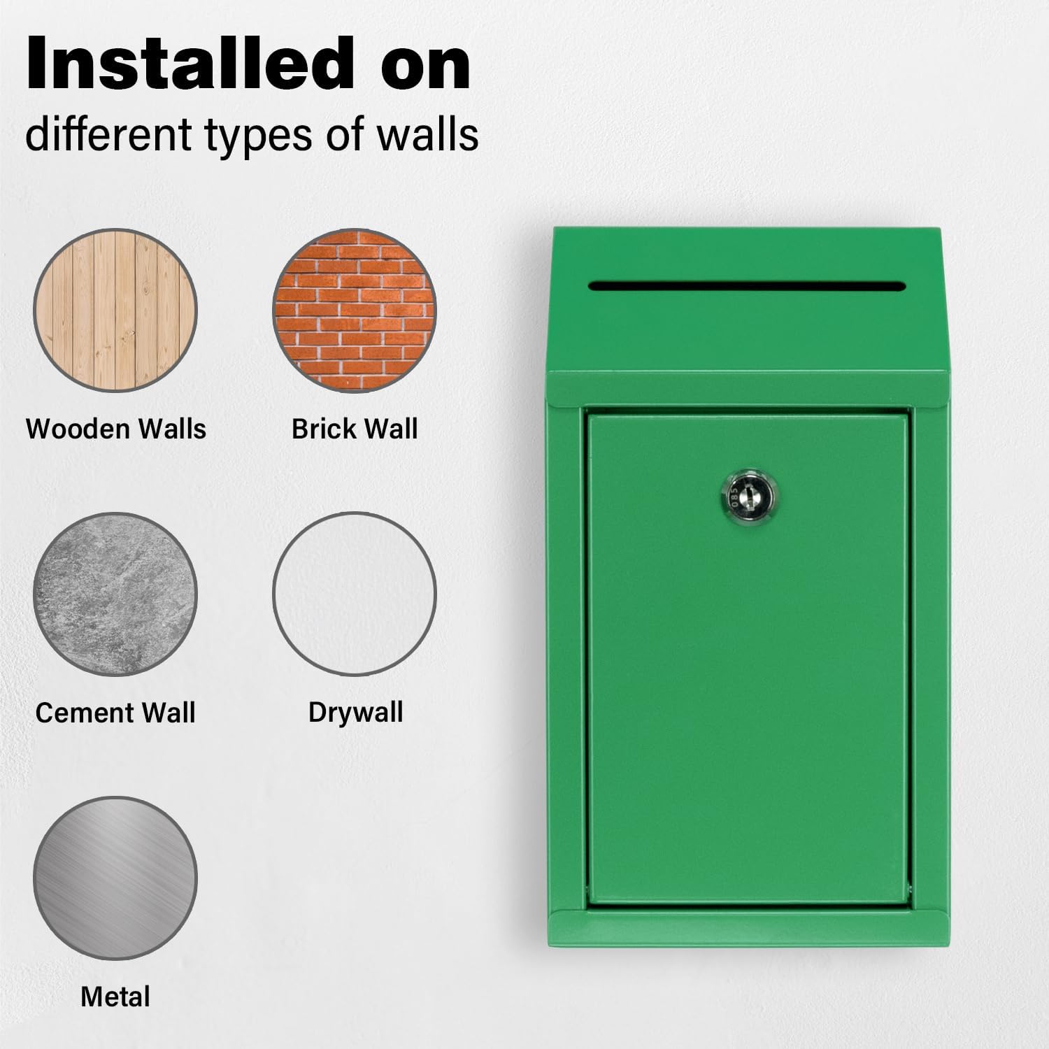 Metal Donation Box with Lock, Wall Mounted, Suggestion Box with 4 Iron Keys, Green, Cash Drop Box with Slot, 1-Pack