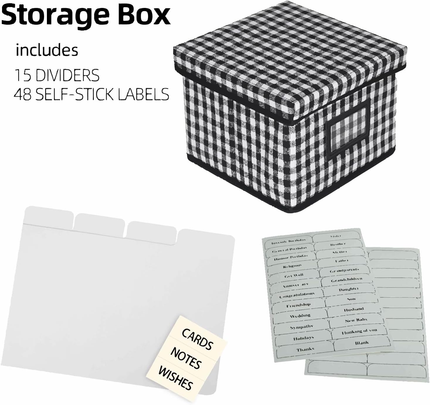 - Large Capacity Storage: The size of our greeting card box is 9.6"x9.1"x7.5“and can accommodate 140+ cards. It includes 15 dividers and 48 self-stick labels , you can organize your cards by calendar month or occasion