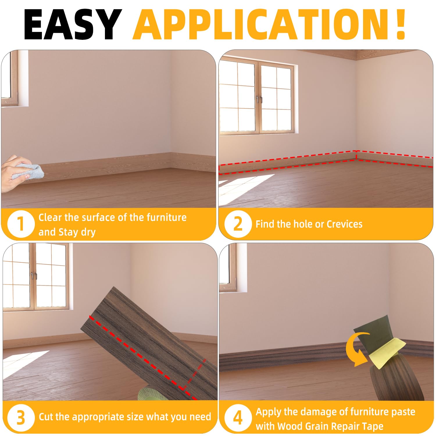 - High Quality - The Wood Grain Repair Tape is made of high quality Self Adhesive, which is durable and elastic, with a smooth surface and not easy to be dirty.When you repair Tables, Chairs, Baseboards, Doors, Windows, Floors, All Kinds of Furniture Renovation, Wood Grain Repair Tape will be your first choice