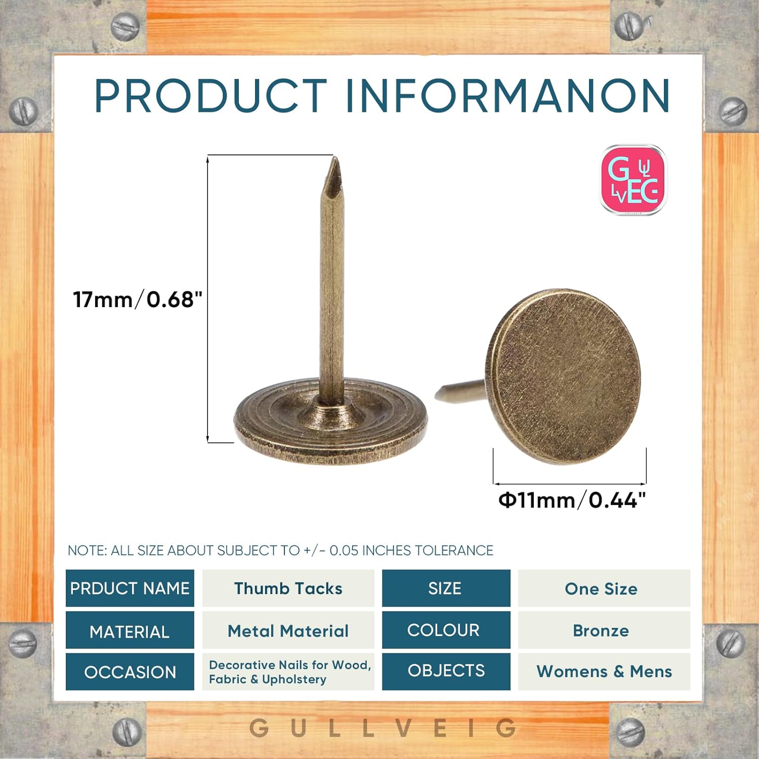 Gullveig Bronze Push Pins and Thumb Tacks: Heavy Duty Flat Upholstery, Long Carpet Tacks, and Decorative Nails for Wood and Fabric, 50 Count