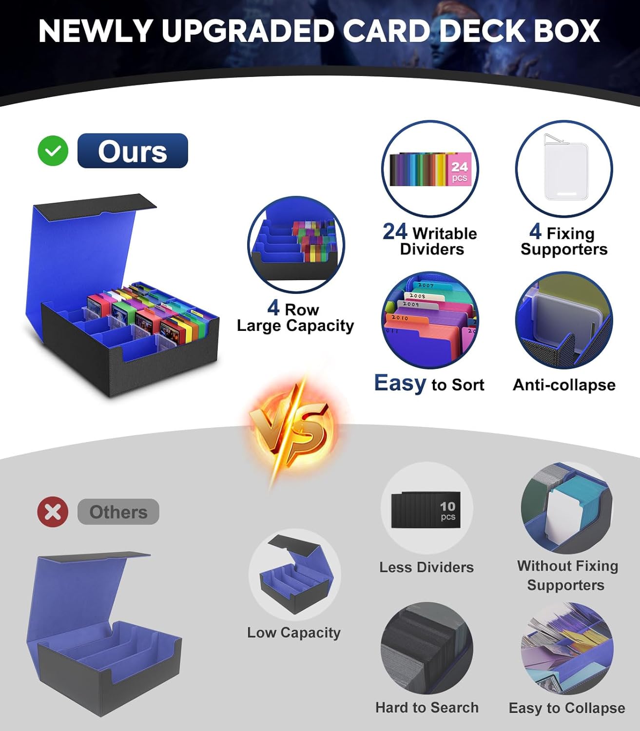 - Upgraded Ultra Capacity Card Deck Box: Our card storage box upgrades 33.3% in capacity from a standard 3-row box to a 4-row box. This TCG deck box can fit 3000+ sleeveless cards, 1800+ single-sleeved cards, or 1500+ double-sleeved cards with ease, excluding top loaders and magnetic holders.
