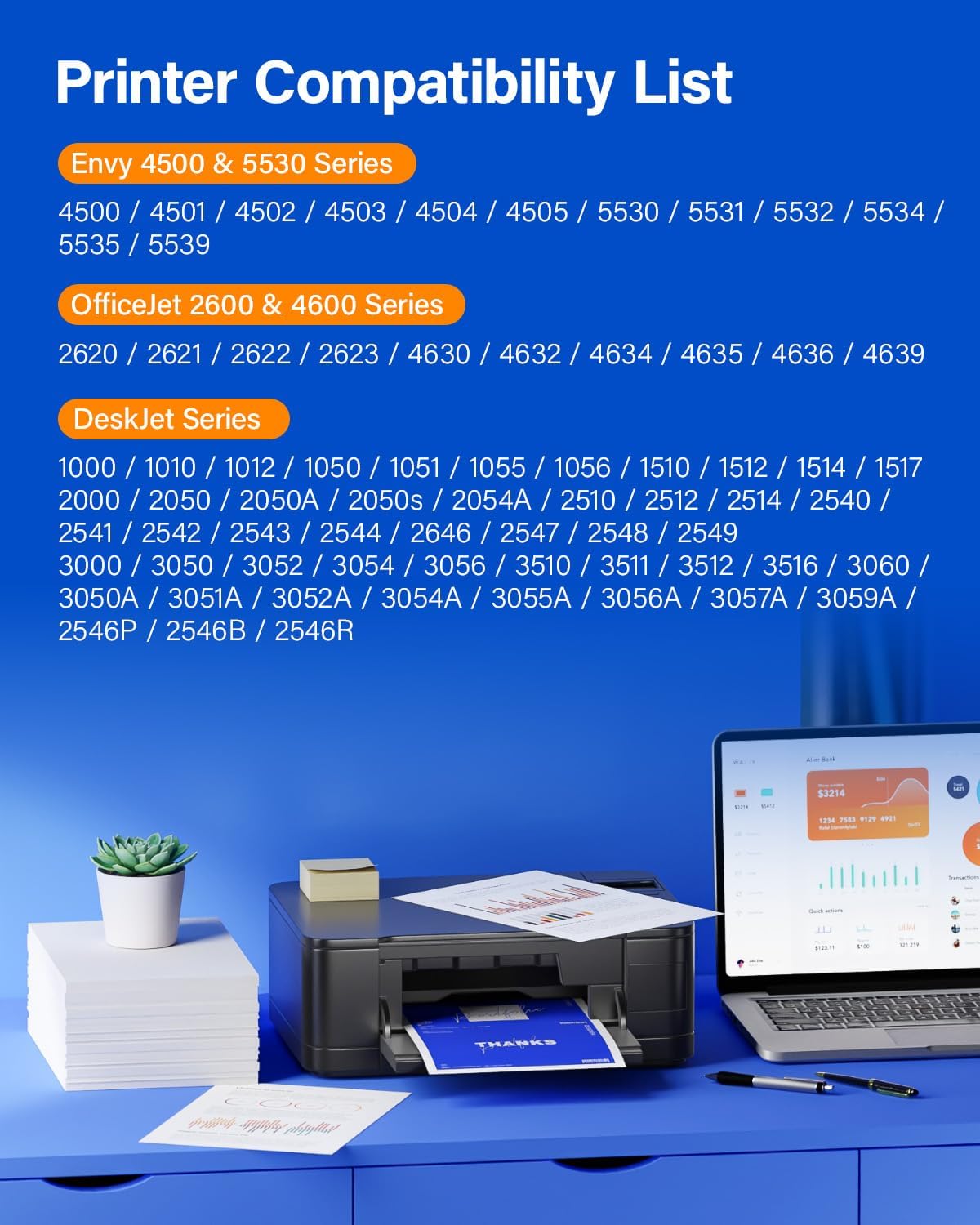- Compatible Printer Models : (2) 2000 2050 2050A 2050s 2054A 2510 2512 2514, (3) 3000 3050 3052 3054 3056 3510 3511 3512 3516, DeskJet Series: (1) 1000 1010 1012 1050 1051 1055, HP Envy Envy 4500 & 5530 Series, HP OfficeJet 2600 & 4600 Series (2) 2000 2050 2050A 2050s 2054A 2510 2512 2514, (3) 3000 3050 3052 3054 3056 3510 3511 3512 3516, DeskJet Series: (1) 1000 1010 1012 1050 1051 1055, HP Envy Envy 4500 & 5530 Series, HP OfficeJet 2600 & 4600 Series