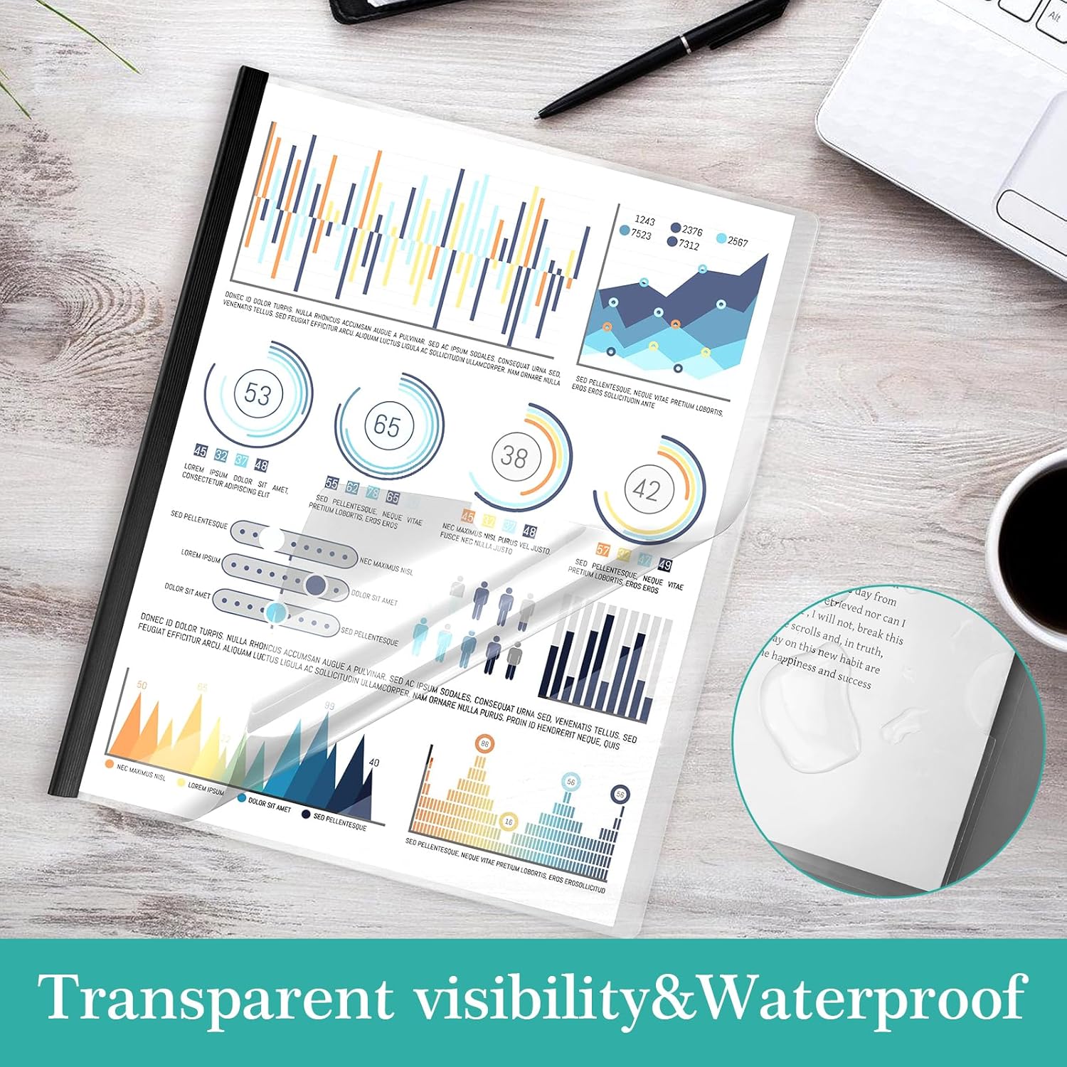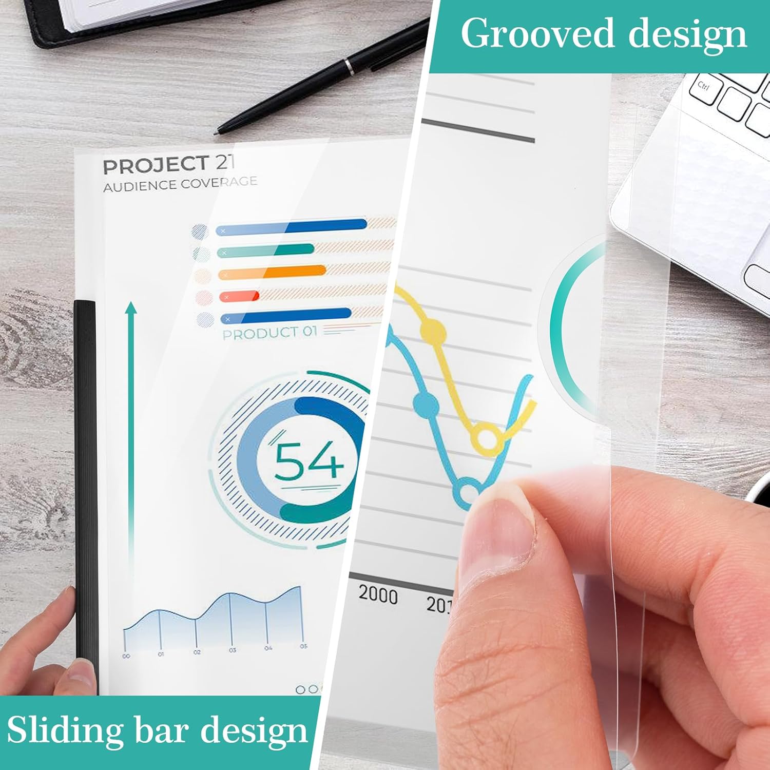 - Usable Size: Designed with precise measurements of 8.9 x11.2 inches, our presentation folders are perfectly sized to accommodate standard paper sizes. The 5.5mil thick transparent cover offers a sturdy yet flexible barrier, while the 1cm wide slide bar can accommodate up to 70 sheets of paper, ensuring ample space for all your notes and materials