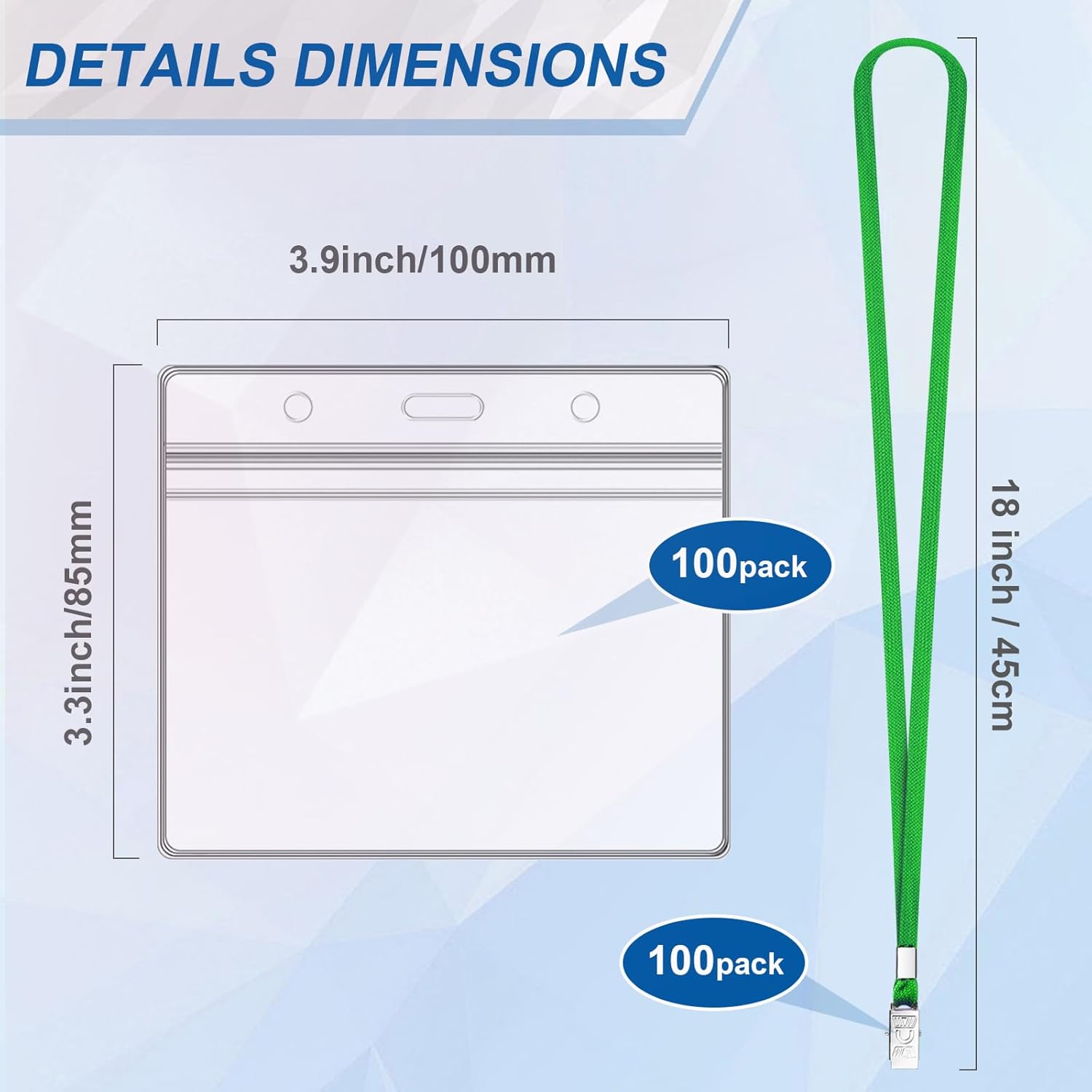100Pcs Lanyards for ID Badges and 100 Pcs Clear Plastic Horizontal Name Badge ID Card Holders, Flat Neck Lanyards with Clip Waterproof Resealable Name Tag Badge ID Card Holders (Green)