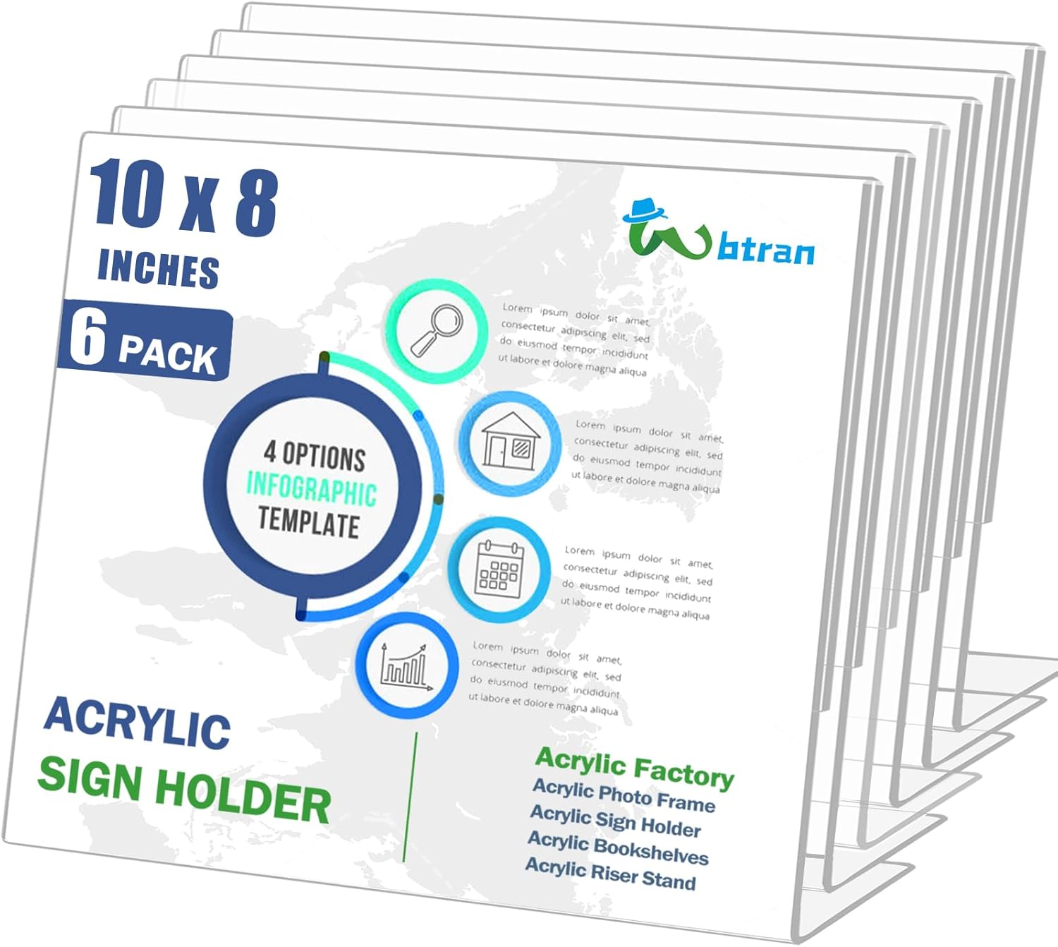 Slanted Back Acrylic Sign Holder 8 x 10 Horizontal, Acrylic Stands for Display 10 x 8, Clear Tabletop Plastic Paper Sign Holder for Office, Home, Restaurant (6 Pack 10x8 Inches)