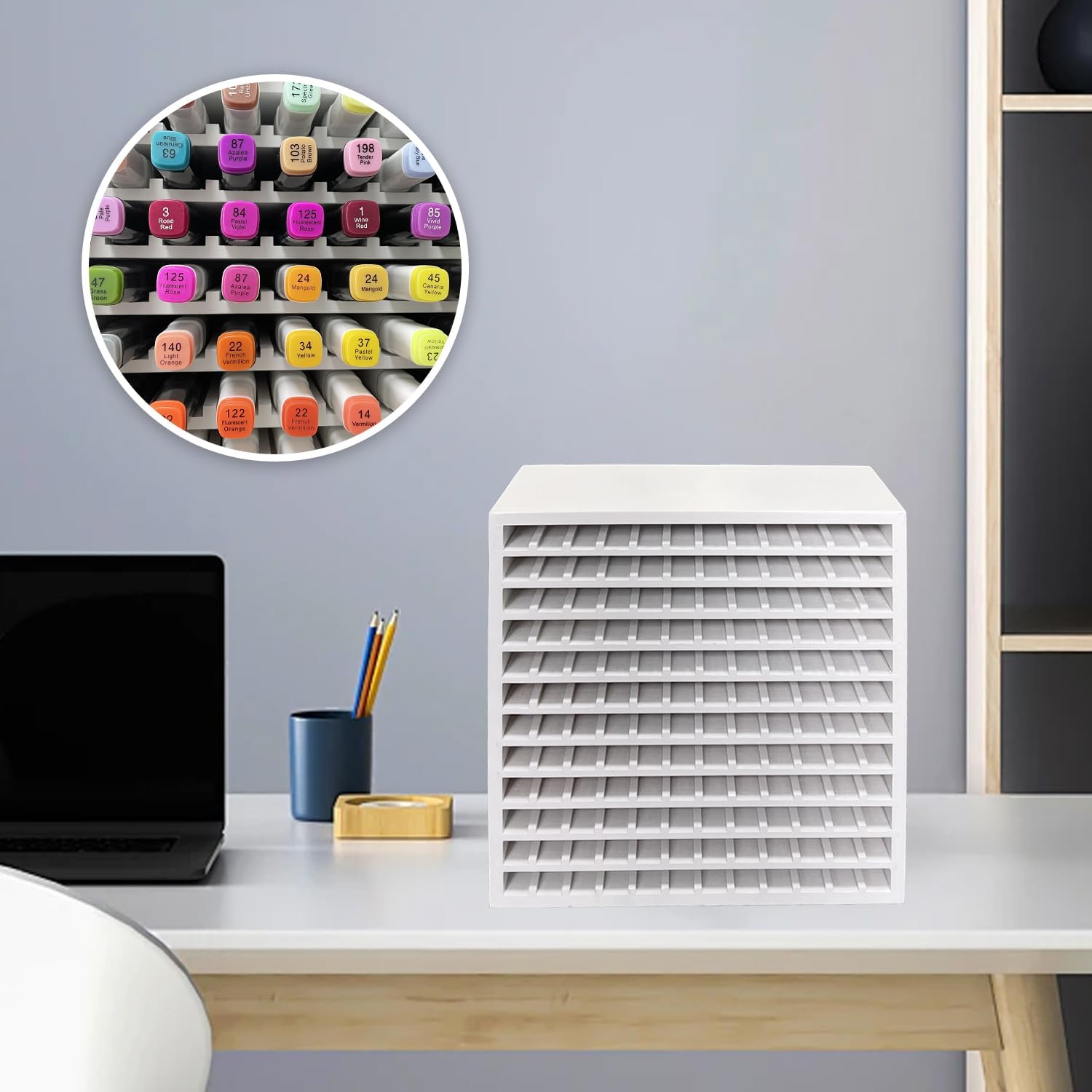 - DECLUTTER YOUR DESK - Say goodbye to the mess on your desk! Our marker organizer features spacious individual compartments, allowing you to neatly arrange and categorize your markers, pens, colored pencils, art brushes, and more. Experience the satisfaction of having an organized workspace.