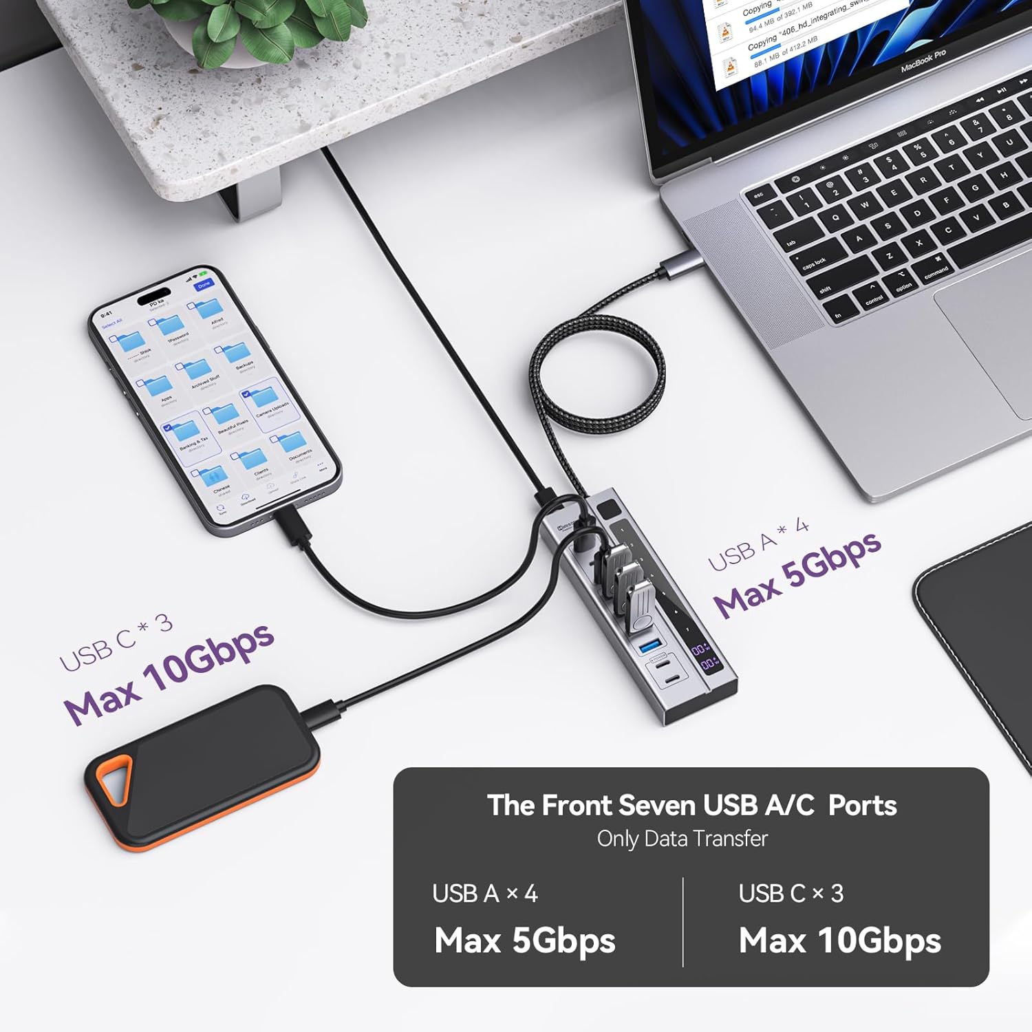 - 【10Gbps/5Gbps Speed Data Transfer】: The usb-c to usb-c hub supports data transfer up to 10Gbps, which is 20 times faster than a USB 2.0 port, it can transfer files, audio, and video efficiently in seconds to external devices. ★Note: The three USBC 3.2 at the top of the USB c ports hub and the four USBA 3.0 at the middle fo the hub ONLY support data transfer.