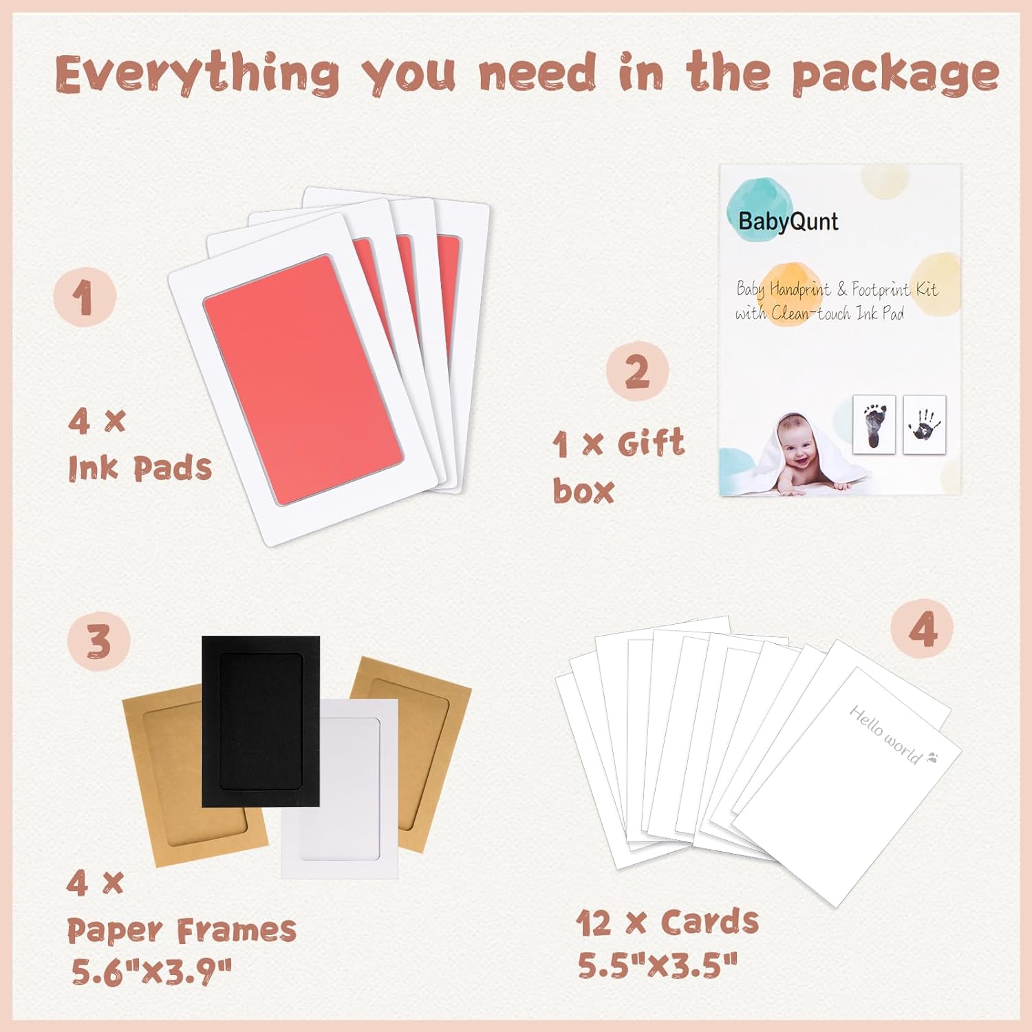 - 【Product Details】: Our baby hand and footprint kit measures 5.0"x3.2" with an ink window of 3.7"x2.3", which is the best size for recording hand and footprints of newborns 0-6 months old or pet paw prints . The ink pad for baby hand and footprints includes 4 clean touch ink pads, 12 stamping cards, and 3 display frames, ensuring you have ample opportunity to capture the best stamp.