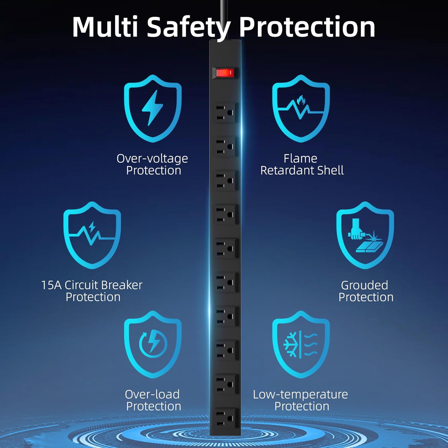 - ✅OVERLOAD PROTECTION:A power switch with lighting has a built-in high quality 15A circuit breaker for overload protection. When the operating current exceeds the rated current, this power strip automatically cuts off the power supply from spikes, fires or other unsafe conditions.