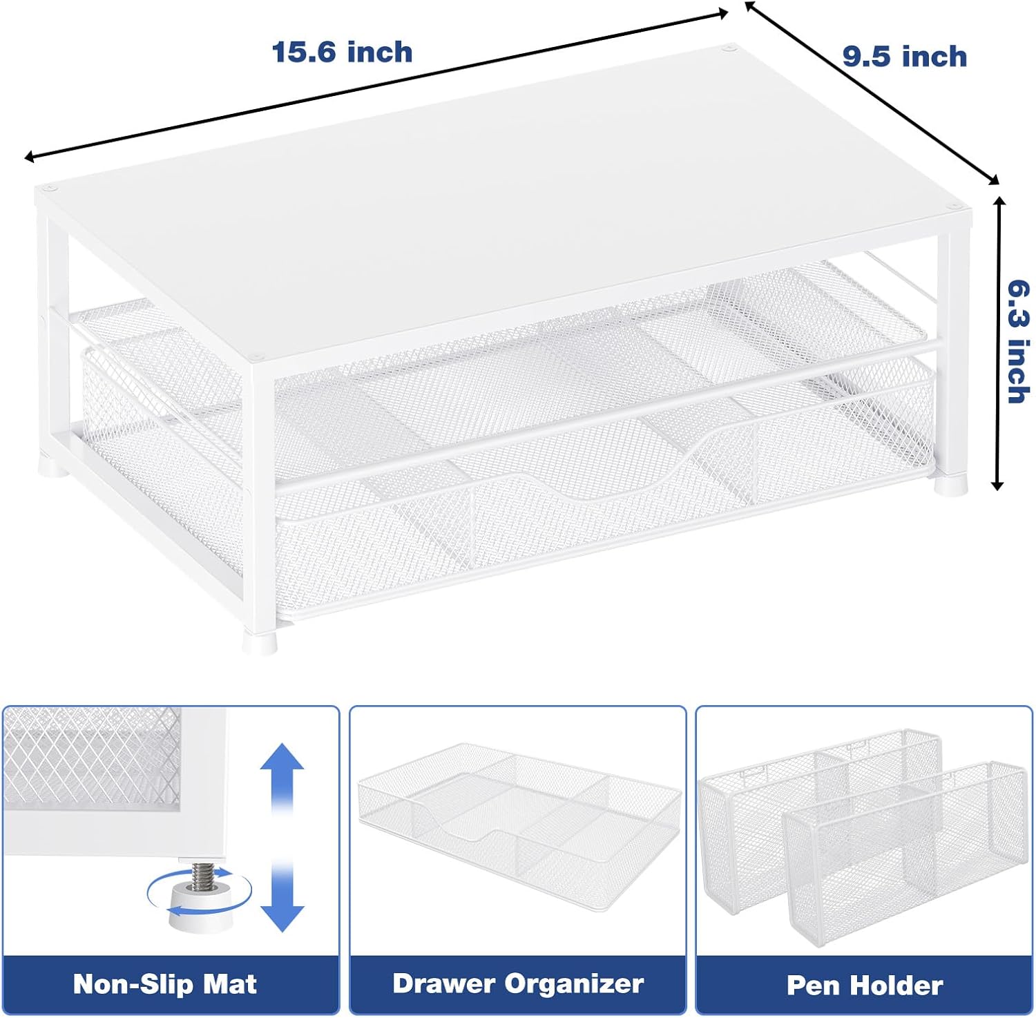 Desk Organizers and Accessories, 2-Tier Computer Monitor Stand Riser with Drawer and 2 Pen Holders, Laptop Stand, Office Desk Accessories for Office Supplies, White