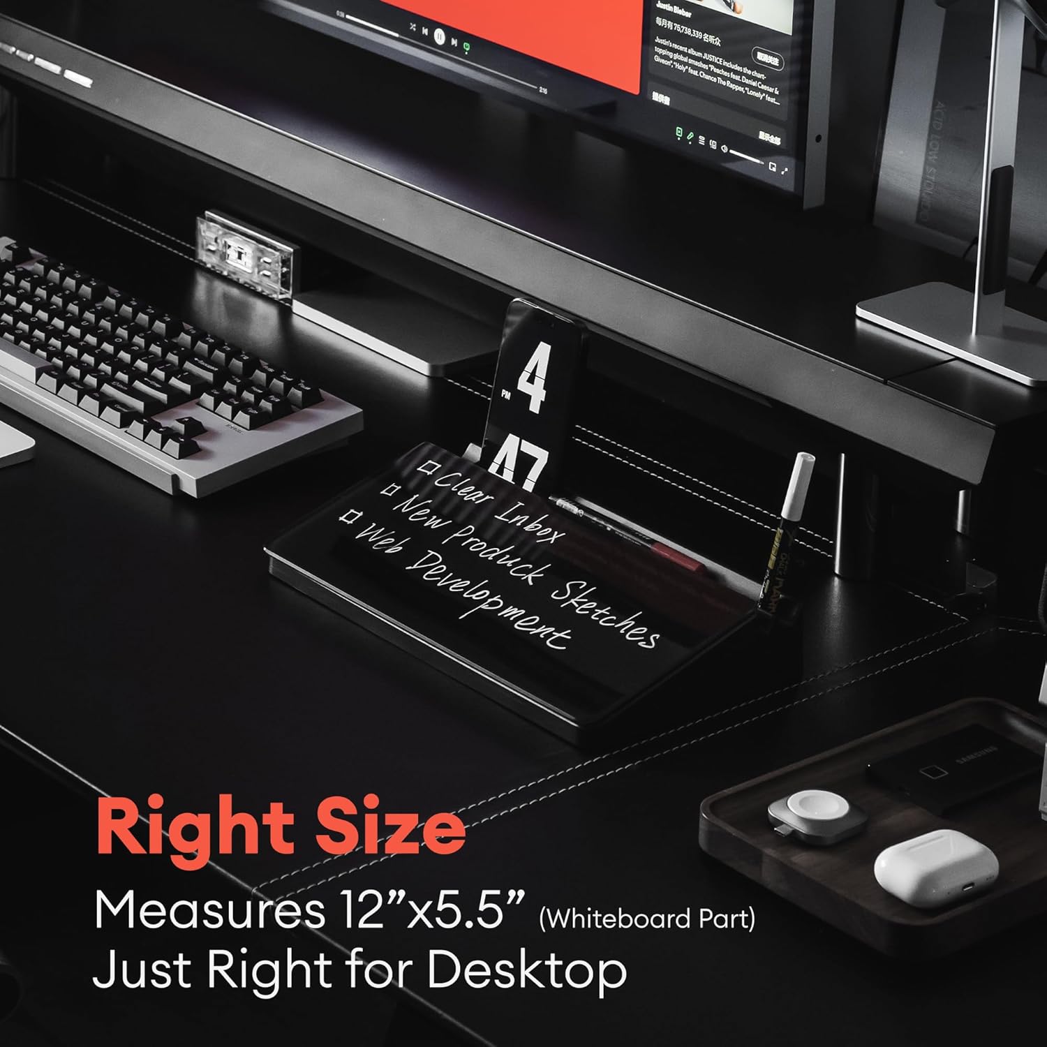 Glass Desktop Whiteboard with Storage 12"x6.5", Black Glass Desk Dry Erase Board Writing Board w. 4 Liquid Chalk Markers,1 Eraser Monitor Memo Board, Home Office Essentials