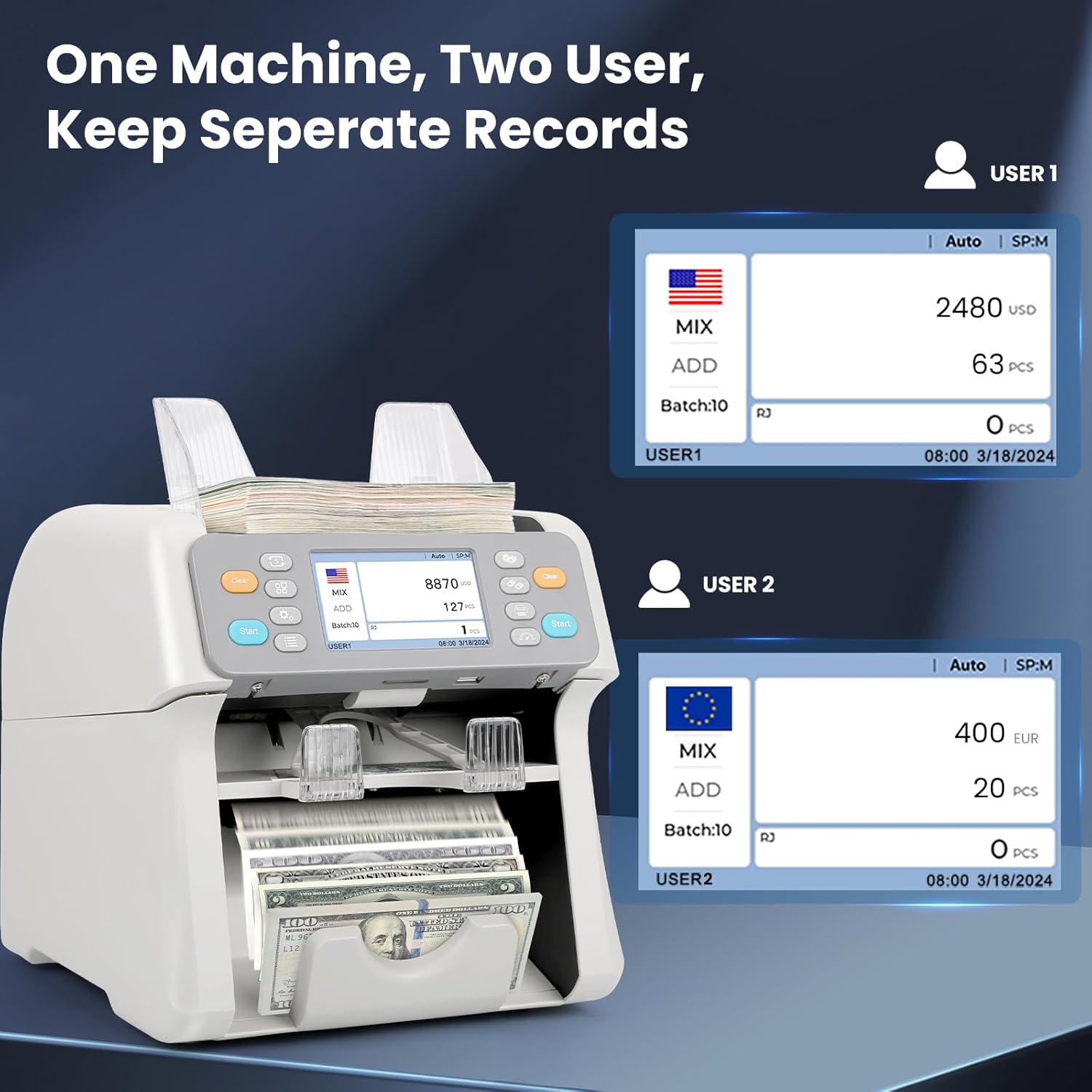 - Save Your Time and Money: 1+1 pockets mixed denomination value counter, counting all denominations together and display a clear breakdown report on screen. The reject pocket is designed for rejecting counterfeit notes, warn notes or foreign notes. Non-stop counting hugely save your time. Multi currency support forUSD, EURO, GBP, CHF, AUD, CAD, MXN, CLP, CRC, PEN, BRL, COP,.etc 12 currencies, suitable for North American and South American markets