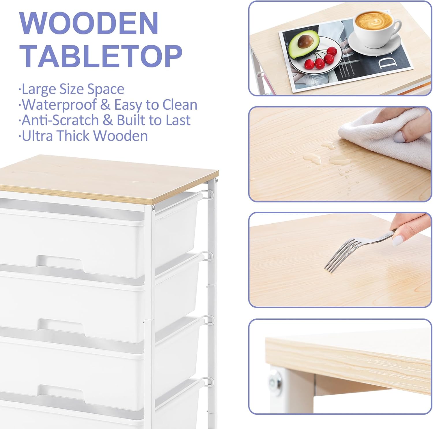 - WOODEN TABLETOP & THICK DRAWERS: Utility cart with drawer boasts a sturdy and durable powder-coated steel frame with water and rust resistance ensures a sturdy construction and built to last. Additionally, the slide-out drawers are made of durable PP material, which also boasts great durability. Holds 33 pounds on tits op plate and 11 pounds per drawer.
