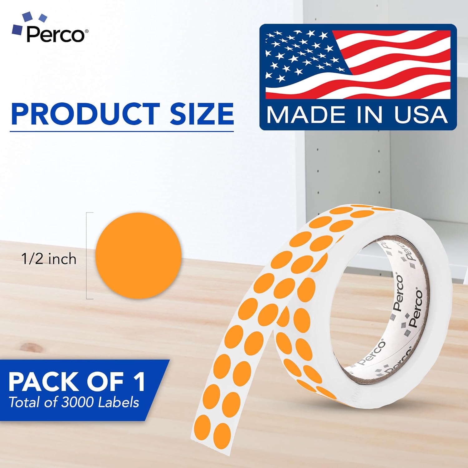 Perco Fluorescent Orange 1/2-Inch Round Circle Dot Sticker Labels with Easy Peel Perforation - 3,000 Labels per Roll - Strong Adhesion, Vibrant Colors for Organizing, Crafting & More - Made in USA