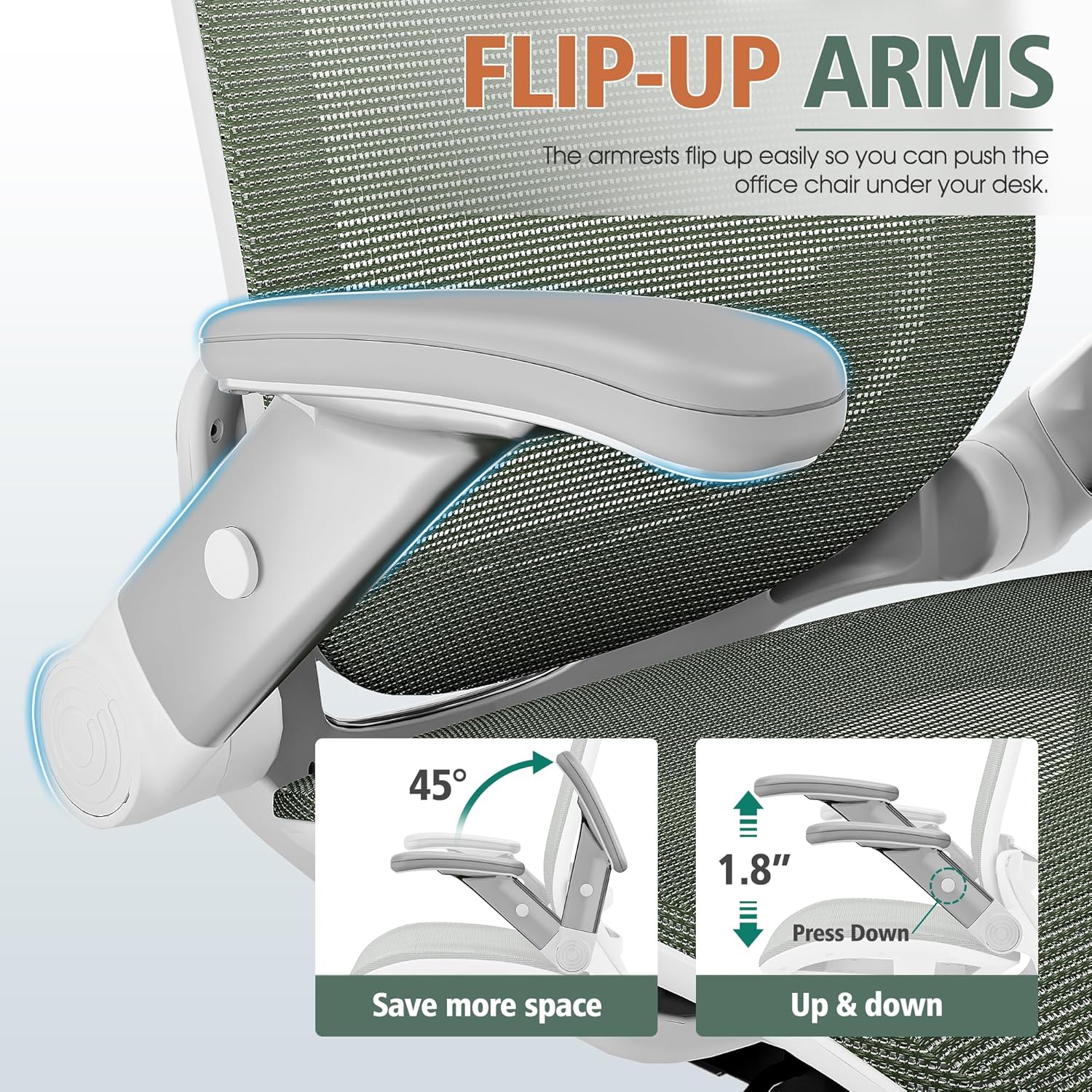 - 【ADJUSTABLE FLIP-UP ARMS】-If you want to make the most of the space under the table or choose a home desk chair for a small space/bedroom, this is the office chair for you! The GABRYLLY ergonomic office mesh chairs' armrest can be folded up(45°) and be adjusted the arms' height(1.8'').