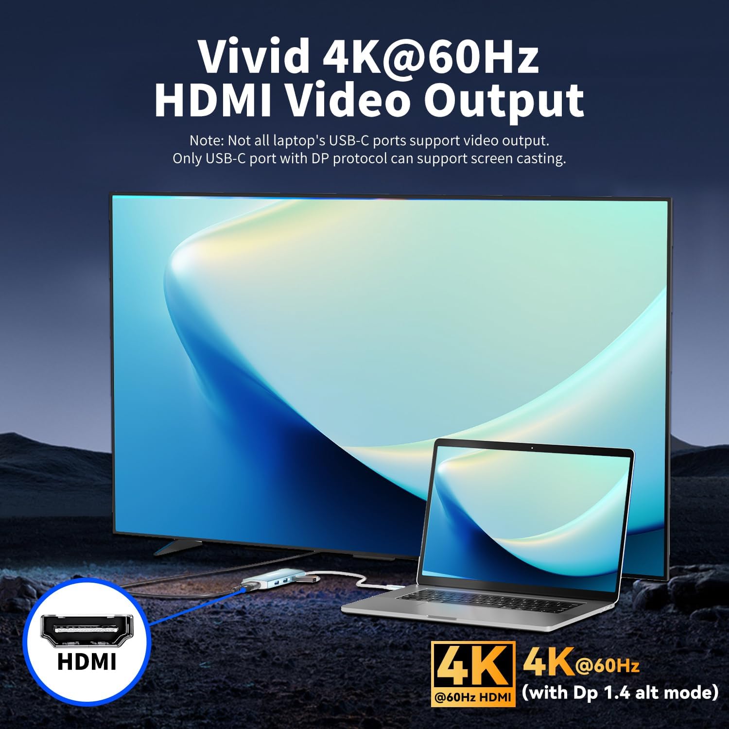 - 4K@60Hz HDMI: This USB C hub can mirror or extend your screen and streams 4K@60Hz UHD (3840x2160@60Hz), full HD 1080p or 3D video directly to your HDTV, monitor, or projector.