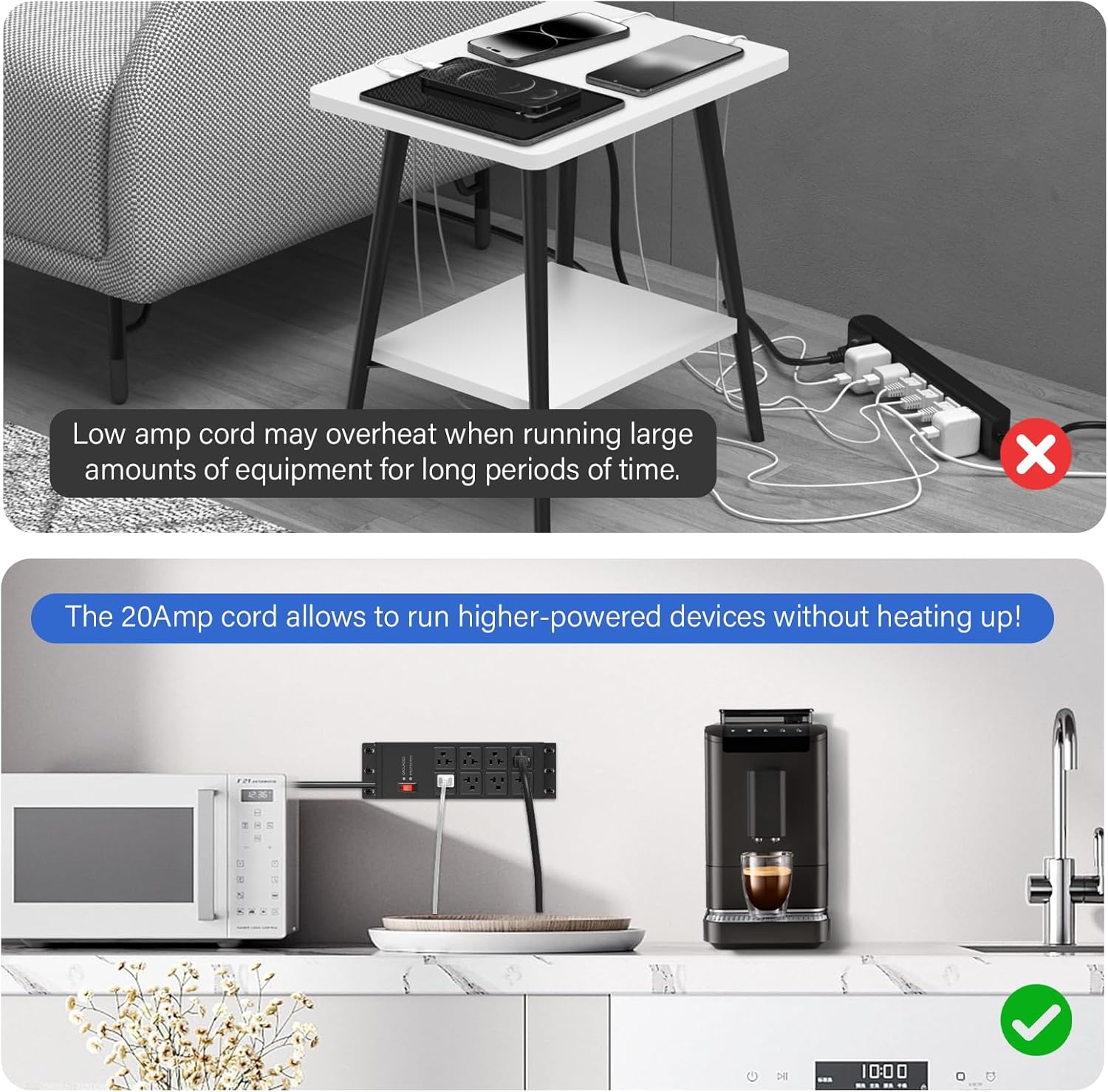 - With 12awg 5-15P extension cord, 6-20R T-Slot adapter for more appliance. Can plug it into a 15A or 20A outlets, if you are using it in a 15A system, do not exceed 1875W.