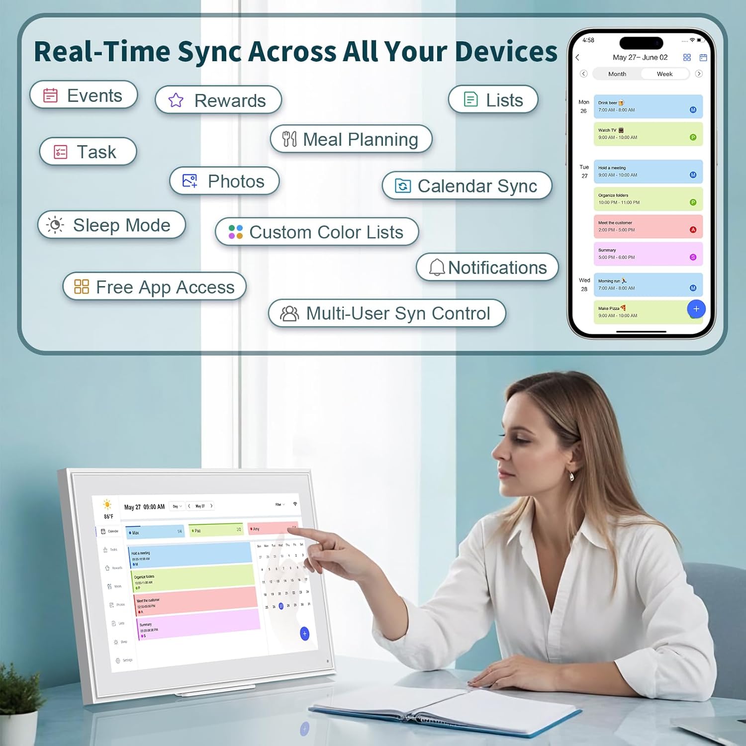- 【Chore Chart and Meal Planning】Compatible with a free downloadable mobile app, you can conveniently add, edit, and manage activities, chores, and meal plans from your phone. This seamless mobile synchronization allows you to update and view your family calendar anytime, anywhere, enhancing flexibility and convenience. It's highly functional for families with busy schedules, making remembering and managing multiple activities easier.