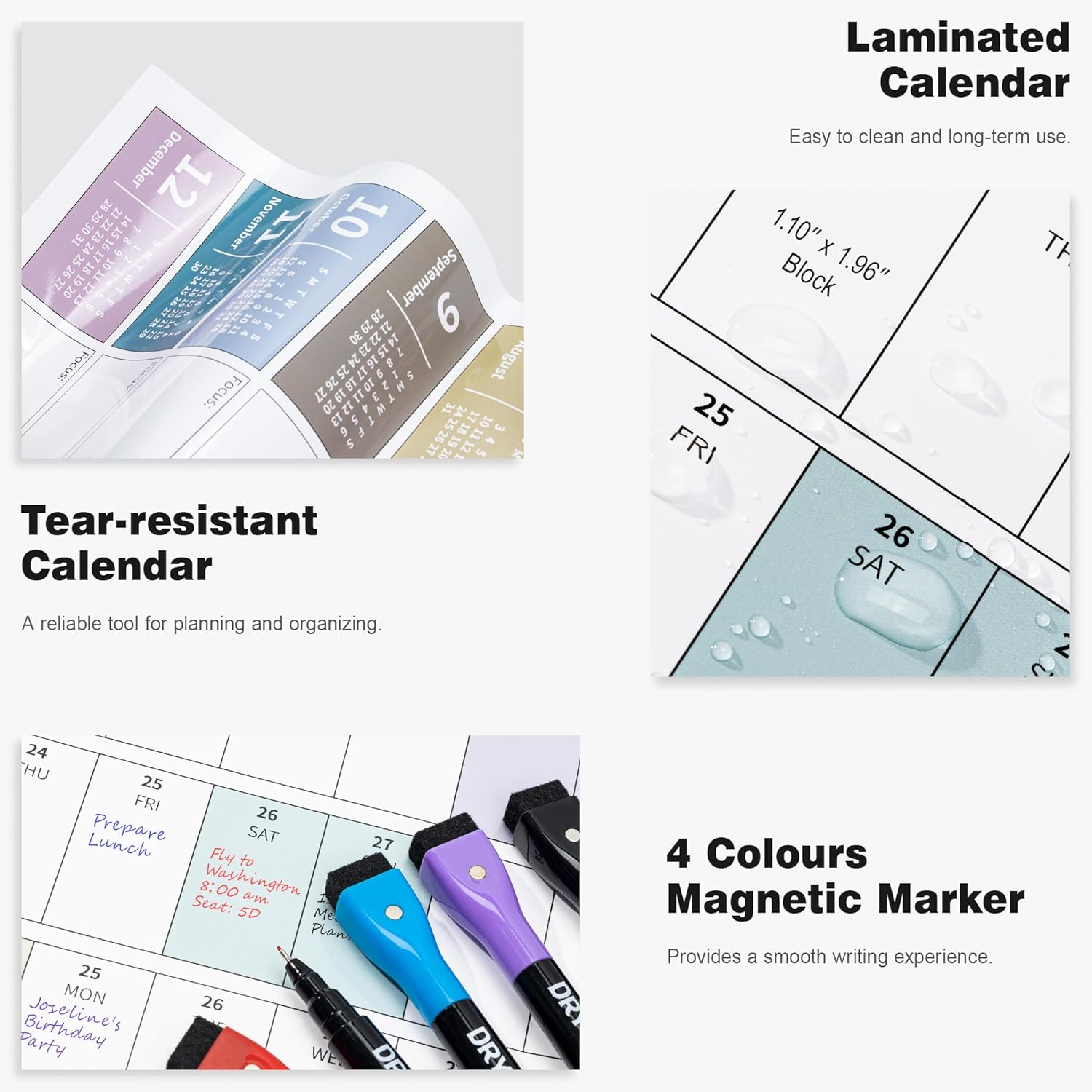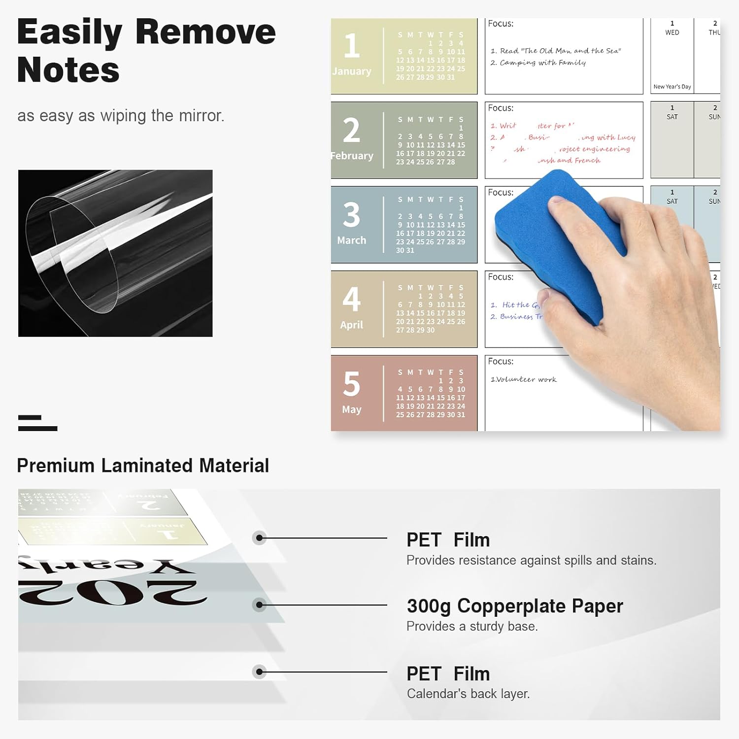 - ✨ Dry Erase Wall Calendar : is made of PET Film and 300 grams Copperplate Paper, providing a durable surface that resists scratches and smudges, while the sturdy Copperplate Paper backing keeps it in place without curling.