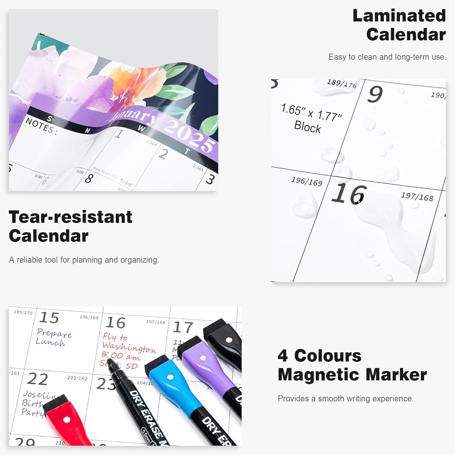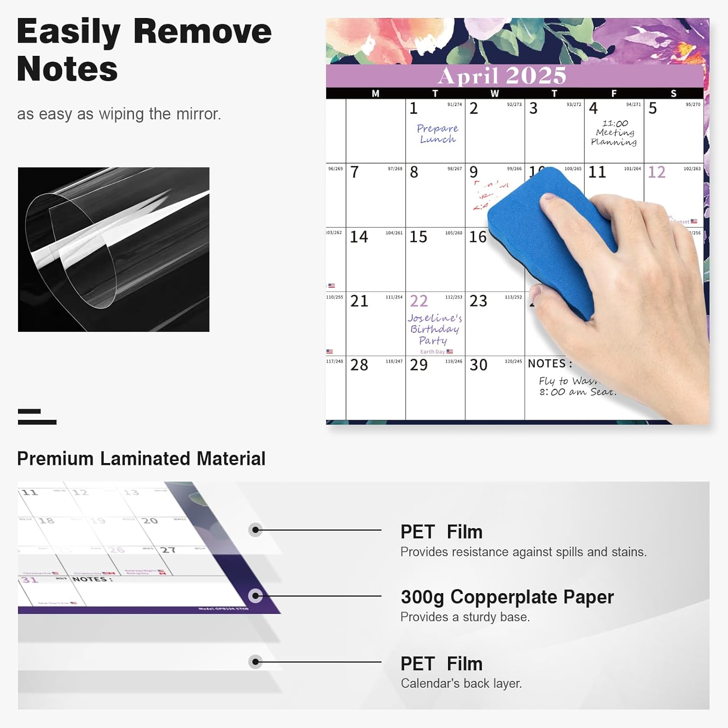 - ✨ Dry Erase Wall Calendar : is made of PET Film and 300 grams Copperplate Paper, providing a durable surface that resists scratches and smudges, while the sturdy Copperplate Paper backing keeps it in place without curling.
